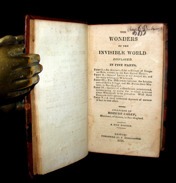 The book : Scarce edition in his original leather binding of (More) Wonders of the Invisible World -- Originally published in London in 1700, it was reprinted in Salem in 1796, and again in 1823. This is the first edition to be published in America outside of Salem. Parts include: Part I. An account of the sufferings of Margaret Rule, written by the Rev. Cotton Mather. Part II. Several Letters to the Author...and his reply relating to Witchcraft. Part III. The Differences between the Inhabitants of Salem Village, and Mr. Parris, their Minister, in New-England. Part IV. Letters of a Gentleman uninterested, endeavouring to prove the received opinions about Witchcraft to be orthodox. With short Essays to their answers. Part V. A short historical Account of matters of fact in that affair.