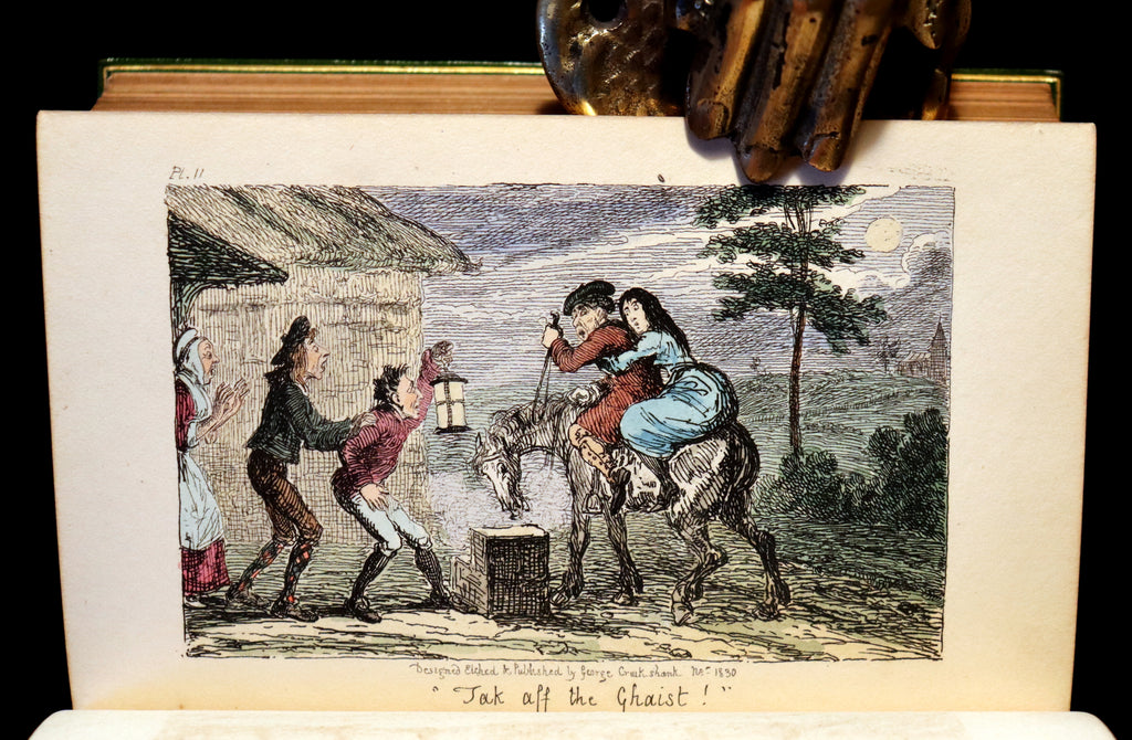 Illustrations: Beautifully illustrated with the frontispiece of the Bow in Edinburgh by Lizars after J. Skene and the wonderful 12 plates by George Cruikshank in IN THREE STATES (colored, uncolored, and India proofs), one of which is hand-colored, the two other states are black and white on a different support paper. 37 illustrations (frontis + (12*3)). A wonderful illustrated First Edition!