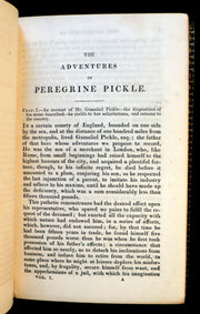 The book: Rare and attractive edition of The Adventures of Peregrine Pickle -- a picaresque novel by the Scottish author Tobias Smollett, first published in 1751 and revised and published again in 1758. It tells the story of an egotistical man who experiences luck and misfortunes in the height of 18th-century European society. The novel begins with the character of Peregrine as a young country gentleman rejected by his cruel mother, ignored by his indifferent father, and hated by his degenerate brother. After their alienation, he turns to Commodore Hawser Trunnion, who raises him. Peregrine's detailed life experience provides a scope for Smollett's satire on human cruelty, stupidity, and greed: from his upbringing, education at Oxford, journey to France, jailing at the Fleet, unexpected succession to his father's fortune, and final repentance and marriage to his beloved Emilia. The novel is written as a series of adventures, with every chapter depicting a new experience. The novel also contains a lengthy independent story called "The Memoirs of a Lady of Quality", written by Frances Vane, Viscountess Vane.