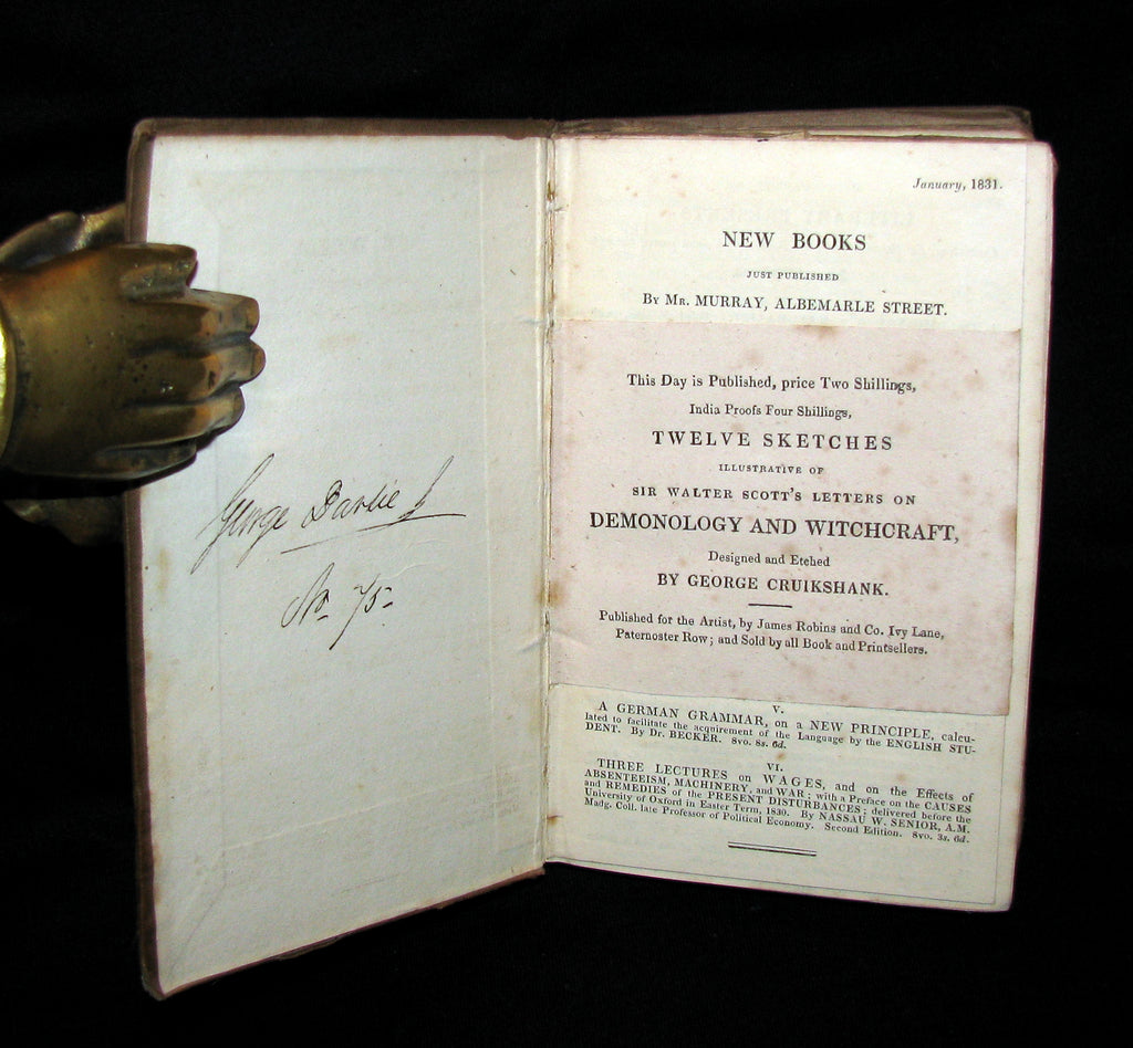 The book : Scarce second edition of Letters on Demonology and Witchcraft in the original publisher binding. -- In ill health following a stroke, Sir Walter Scott wrote Letters on Demonology and Witchcraft at the behest of his son-in-law, J. G. Lockhart, who worked for a publishing firm. Letters was written when educated society believed itself in enlightened times due to advances in modern science. Letters, however, revealed that all social classes still held beliefs in ghosts, witches, warlocks, fairies, elves, diabolism, the occult, and even werewolves. Sourcing from prior sixteenth- and seventeenth-century treatises on demonology along with contemporary accounts from England, Europe, and North America (Cotton Mather's Magnalia Christi, for one), Scott's discourses on the psychological, religious, physical, and preternatural explanations for these beliefs are essential reading for acolytes of the dark and macabre; the letters dealing with witch hunts, trials (Letters Eight and Nine), and torture are morbidly compelling. Scott was neither fully pro-rational modernity nor totally anti-superstitious past, as his skepticism of one of the "new" sciences (skullology, as he calls it) is made clear in a private letter to a friend. Thus, Letters is both a personal and intellectual examination of conflicting belief systems, when popular science began to challenge superstition in earnest.