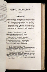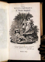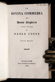 The book: A finely bound 1839 edition of Dante’s masterpiece La Divina Commedia, with scholarly annotations by Paolo Costa. This three-volume set was published in Florence and includes extensive commentary and interpretations that offer rich insights into Dante’s epic poem. This edition is a significant literary and historical artifact, capturing Dante's narrative journey through Hell, Purgatory, and Paradise.