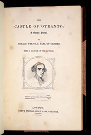 The book: Scarce illustrated edition of The Castle of Otranto -- a 1764 novel by Horace Walpole. It is generally regarded as the first Gothic novel. In the second edition, Walpole applied the word 'Gothic' to the novel in the subtitle – "A Gothic Story". The novel merged medievalism and terror in a style that has endured ever since. The aesthetics of the book-shaped modern-day gothic books, films, art, music, and the goth subculture. This 1840 edition features a memoir of the author and presents Walpole's story in a more refined format compared to earlier editions, as noted in the publisher's advertisement.