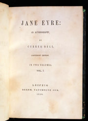 The book: This 1850 Tauchnitz copyright edition of "Jane Eyre" by Charlotte Brontë, published under her pseudonym Currer Bell, is a rare early version of one of the most influential novels in English literature. The book is issued in two volumes bound as one and includes the text based on the Third London Edition, ensuring that it captures the refinements and final intentions of Brontë's narrative. "Jane Eyre" chronicles the life, struggles, and ultimately the emotional and moral development of its titular character, making it a seminal work in the development of the novel form and a classic of feminist literature.