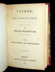 The book : Rare edition of Vathek (alternatively titled Vathek, an Arabian Tale or The History of the Caliph Vathek) -- a Gothic novel written by William Beckford. It was composed in French beginning in 1782, and then translated into English by Reverend Samuel Henley in which form it was first published in 1786 without Beckford's name as An Arabian Tale, From an Unpublished Manuscript, claiming to be translated directly from Arabic. The first French edition, titled simply as Vathek, was published in December 1786 (postdated 1787). In the twentieth century some editions include The Episodes of Vathek (Vathek et ses épisodes), three related tales intended by Beckford to be so incorporated, but omitted from the original edition and published separately long after his death.