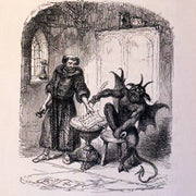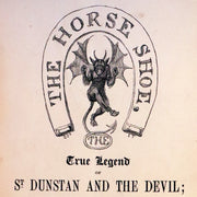 The book: Attractive and scarce first edition of The True Legend of St Dunstan and the Devil; Showing How the Horse-Shoe Came to be a Charm Against Witchcraft. It relates how Dunstan nailed a horseshoe to the Devil's foot when he was asked to re-shoe the Devil's cloven hoof. This caused the Devil great pain, and Dunstan only agreed to remove the shoe and release the Devil after he promised never to enter a place where a horseshoe is over the door. This is claimed as the origin of the lucky horseshoe.