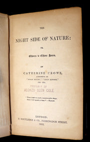 The book : Rare third edition of this famous popular examination of supernatural phenomena of the 19th century. Catherine Crowe turned increasingly to supernatural subjects, inspired by German writers. Her collection The Night-side of Nature (1848) became her most popular work . It was translated into German and French, and is said to have influenced the views of Charles Baudelaire. Her own involvement in such matters came to a bizarre culmination in February 1854, when she was discovered naked in Edinburgh one night, convinced that spirits had rendered her invisible. She was treated for mental illness and recovered. This edition comprises the original (two volumes bound as one), with some revisions and additions and a new preface. An intriguing collection of sketches and anecdotes relating to ghosts and the mystery of life as understood by this noted Victorian novelist