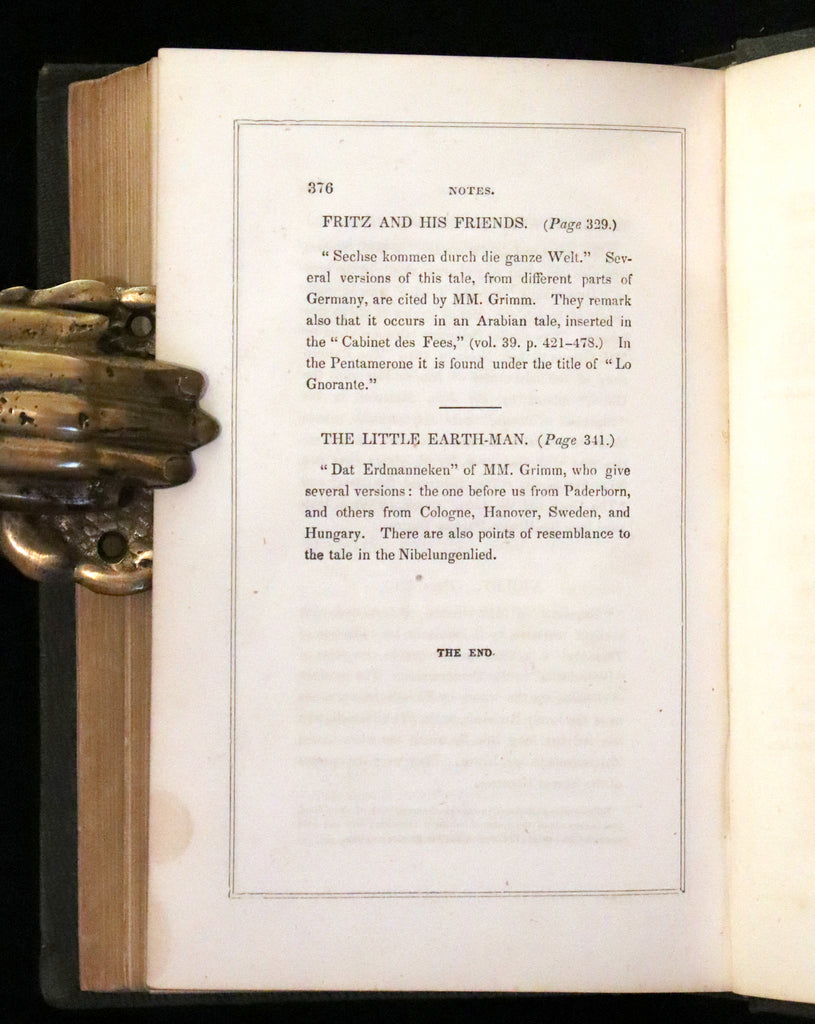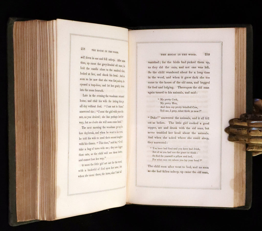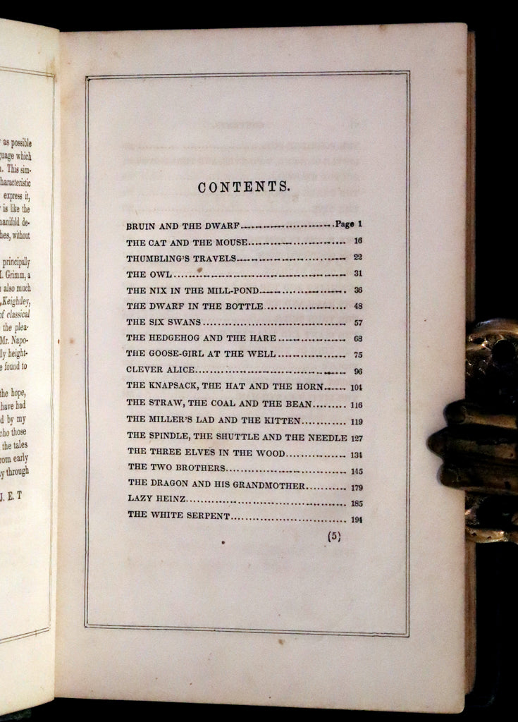 The book: Scarce and attractive First edition of this English translation of Brothers Grimm fairy tales never translated in English before including Bruin and the Dwarf, The Cat and the Mouse, Thumbling's Travels, The Owl, The Nix in the Mill-Pond, The Dwarf in the Bottle, The Six Swans, The Hedgehog and the Hare, The Goose-Girl At the Well, Clever Alice, The Knapsack The Hat and the Horn, The Straw The Coal and the Bean, The Miller's Lad and the Kitten, The Spindle the Shuttle and the Needle, The Three Elves in the Wood, The Two Brothers, The Dragon and his Grandmother, Lazy Heinz, The White Serpent, The Porridge-Pot, Little One-Eye Two-Eye and Three-Eyes, Doctor Knowall, The Pink, The Drummer, The House in the Wood, The Gold Children, The Good Bargain, Dummling and the Toad, The Hare and his Wife, The True BRide, The Giant and the Tailor, The King of the Birds, Violet, Fritz and his Friends, The Little Earth-Man.