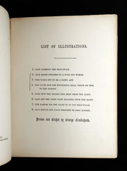 Published by David Bogue in the mid-1850s, the hand-coloured issue of Jack & the Bean-Stalk is notably rare. Most surviving copies appear in plain black-and-white; fully coloured examples such as this one were produced in very small numbers and seldom appear on the market. Hand-colouring emphasizes Cruikshank’s lively, dramatic line work and adds a vivid theatricality to Jack’s ascent, the fairy interventions, and the giant’s lumbering pursuit.