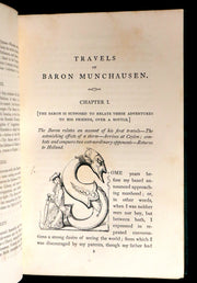 The book: Rare and attractive First Crowquill illustrated edition of -- The Travels and Surprising Adventures of Baron Munchausen -- Baron Munchausen is a fictional German nobleman created by the German writer Rudolf Erich Raspe in his 1785 book Baron Munchausen's Narrative of his Marvellous Travels and Campaigns in Russia. The character is loosely based on a real baron, Hieronymus Karl Friedrich, Freiherr von Münchhausen.