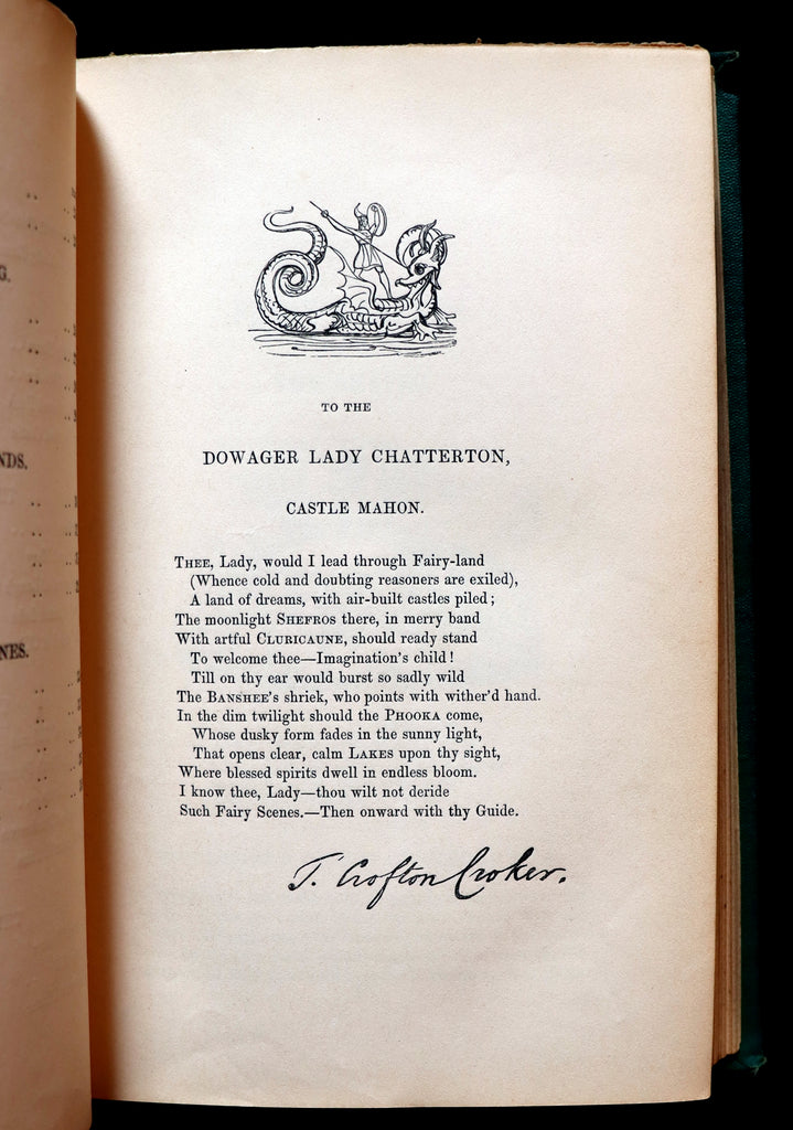 The book: Nice and attractive edition of Fairy Legends and Traditions of the South of Ireland -- Although Fairy Legends purported to be an anthology of tales Croker had collected on his field trips, he had lost his manuscript notes and the work had to be reconstructed with the help of friends.