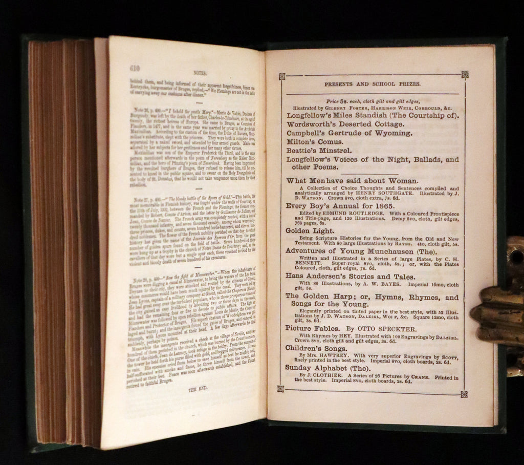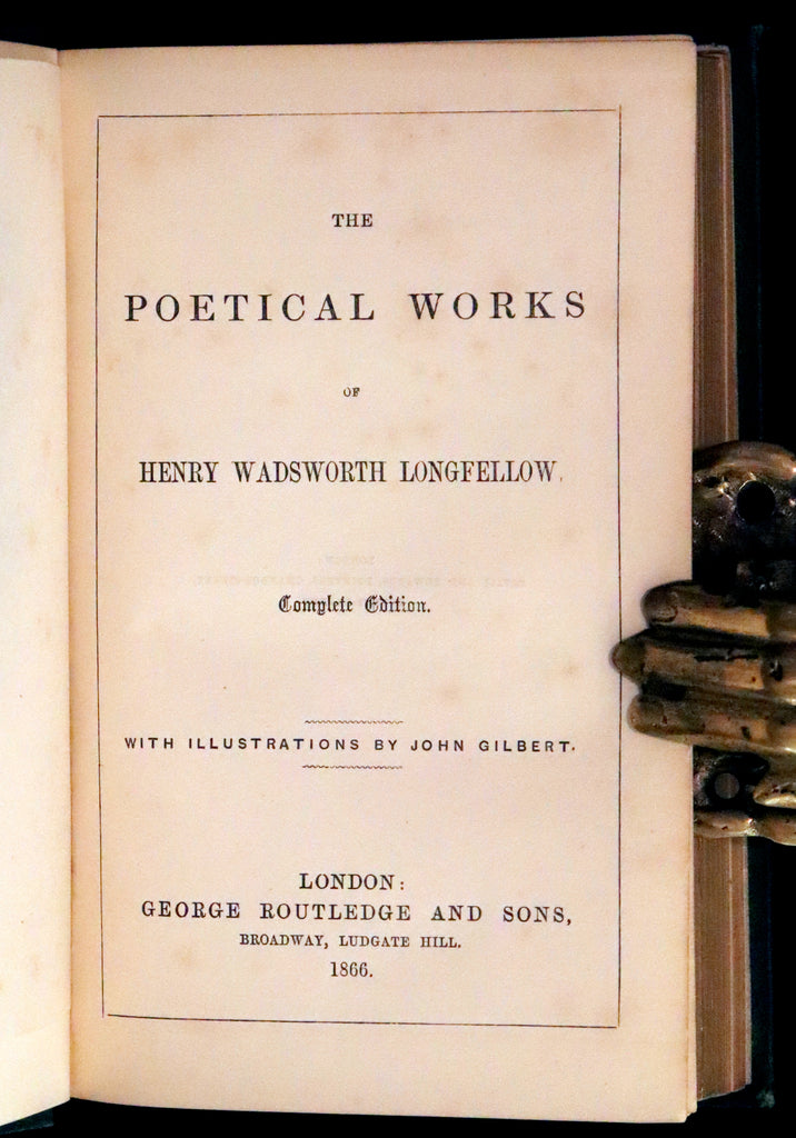 The book: An all-encompassing attractive edition of THE POETICAL WORKS OF HENRY WADSWORTH LONGFELLOW, filled with the revered poet's evocative and powerful verse. This complete edition from 1866, published by George Routledge and Sons, is beautifully illustrated by John Gilbert, enhancing the depth and breadth of Longfellow's poetic landscape.