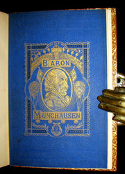 The book : Rare and very attractive color illustrated edition, bound in a beautiful binding by Bartlett & Co. Boston, of -- The Travels and Surprising Adventures of Baron Munchausen -- Baron Munchausen is a fictional German nobleman created by the German writer Rudolf Erich Raspe in his 1785 book Baron Munchausen's Narrative of his Marvellous Travels and Campaigns in Russia. The character is loosely based on a real baron, Hieronymus Karl Friedrich, Freiherr von Münchhausen.