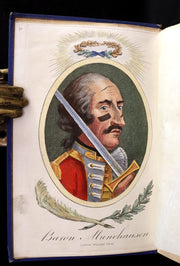 The book: Rare and attractive illustrated early edition of -- The Travels and Surprising Adventures of Baron Munchausen -- Baron Munchausen is a fictional German nobleman created by the German writer Rudolf Erich Raspe in his 1785 book Baron Munchausen's Narrative of his Marvellous Travels and Campaigns in Russia. The character is loosely based on a real baron, Hieronymus Karl Friedrich, Freiherr von Münchhausen.