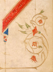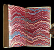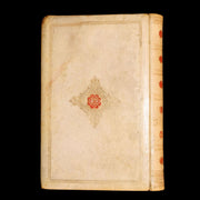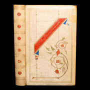 Binding: Attractive and good contemporary full vellum binding with elaborate gilt and red decorations to the spine (five gilt floral tools) and a richly illuminated front cover featuring a red-and-blue banner with floral tendrils. Rear board with central gilt medallion (hinges tight, overall worn and scuffed - as shown, with a 1-inch tear to the front outer hinge but binding remains tight and secure - as shown, wear to the upper external vellum corner - as shown) under a protective removable mylar cover. All edges gilt.
