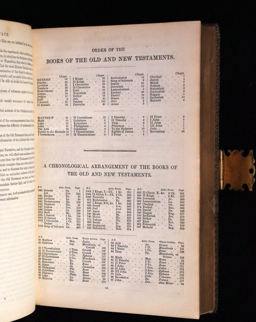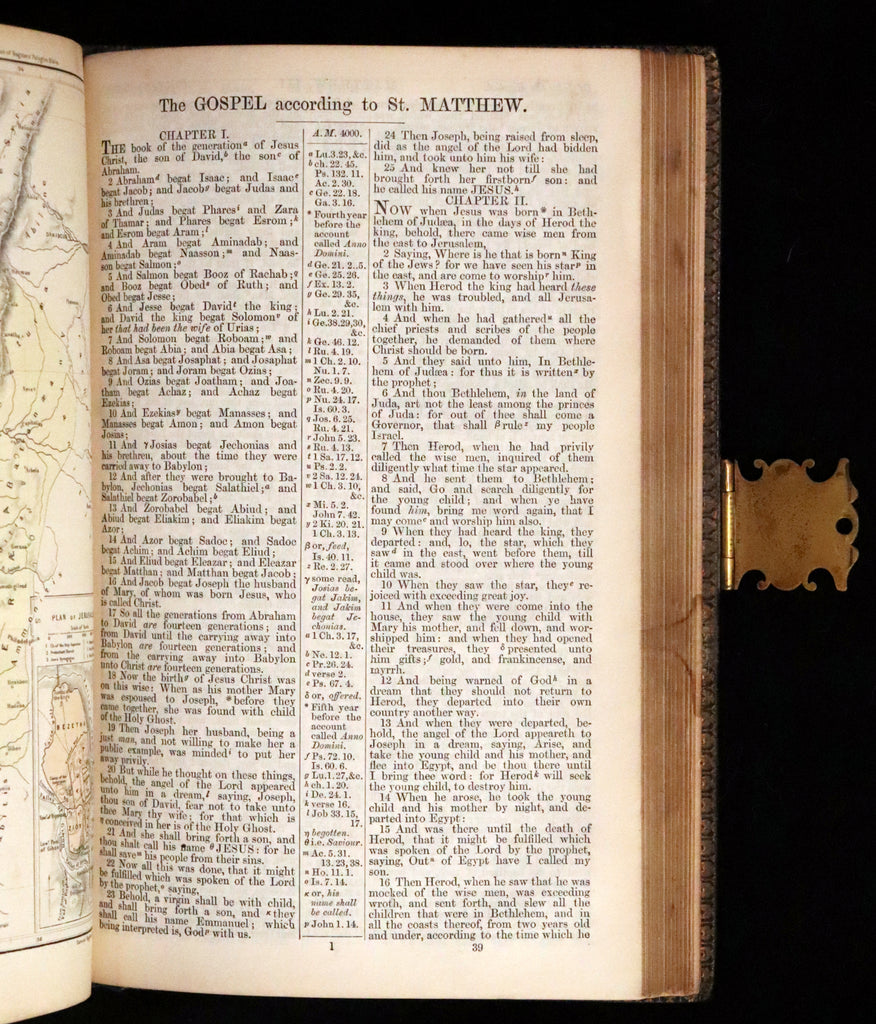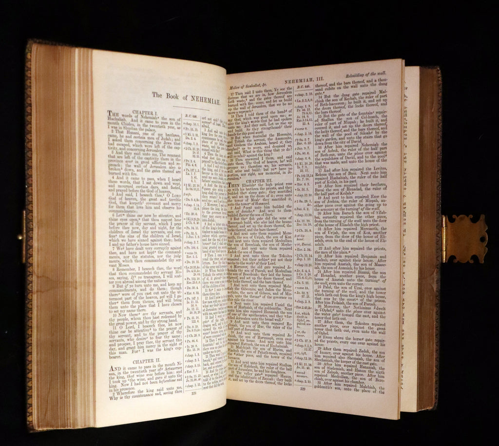 Binding: Attractive and very good original full embossed black pebbled leather binding, finely bound and signed by Bagster, gilt title on spine, with working clasp (hinges fine, overall slightly worn and scuffed - as shown) under a protective mylar cover. All edges gilt.