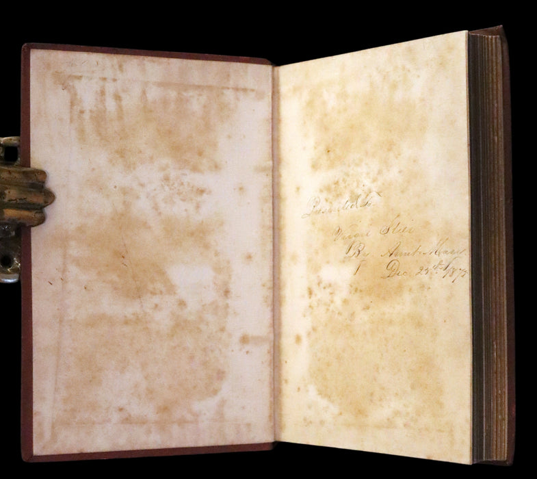 Content: Very good content (bright, tight and clean, rare foxing or staining mainly on the preliminary and last pages - as shown, dry flowers (removed) offsetting in the inner margin of 2 pages - as shown, gift note of a previous 1872 owner on the first endpaper - as shown).