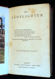The book: Rare in this binding and with colored illustrations. An attractive early edition of The Lamplighter -- a sentimental novel written by Maria Susanna Cummins and published in 1854, and a best-selling novel of its era. The Lamplighter tells the story of Gertrude Flint, an abandoned and mistreated orphan rescued at the age of eight by Trueman Flint, a lamplighter, from her abusive guardian, Nan Grant. Gertrude is lovingly raised and taught virtues and religious faith. She becomes a moralistic woman. In adulthood, she is rewarded for her long-suffering with marriage to a childhood friend.