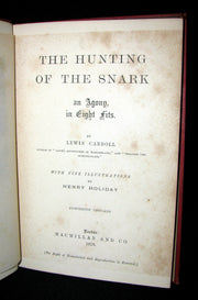 The book : Rare and attractive first edition, second reprint (eighteenth thousand) published in 1876. It has the original red cloth boards with triple ruled gilt edging. On the front board is a gilt image of a Bellman and on the rear board is a slightly smaller image of a Beaver. There are nine lovely illustrations by Henry Holiday (see photos) and a page advertising Carroll's other works at the rear of the book.The Hunting of the Snark (An Agony in 8 Fits) is a poem written by English writer Lewis Carroll. It is typically categorised as a nonsense poem. Written from 1874 to 1876, the poem borrows the setting, some creatures, and eight portmanteau words from Carroll's earlier poem "Jabberwocky" in his children's novel Through the Looking-Glass (1871).