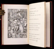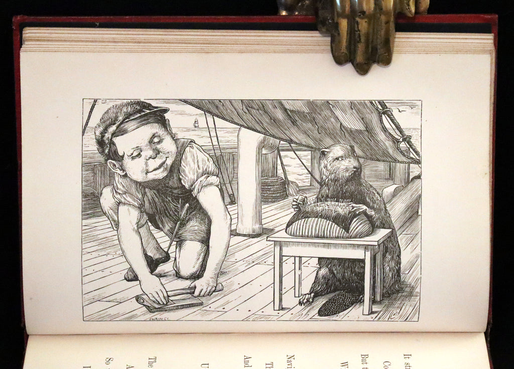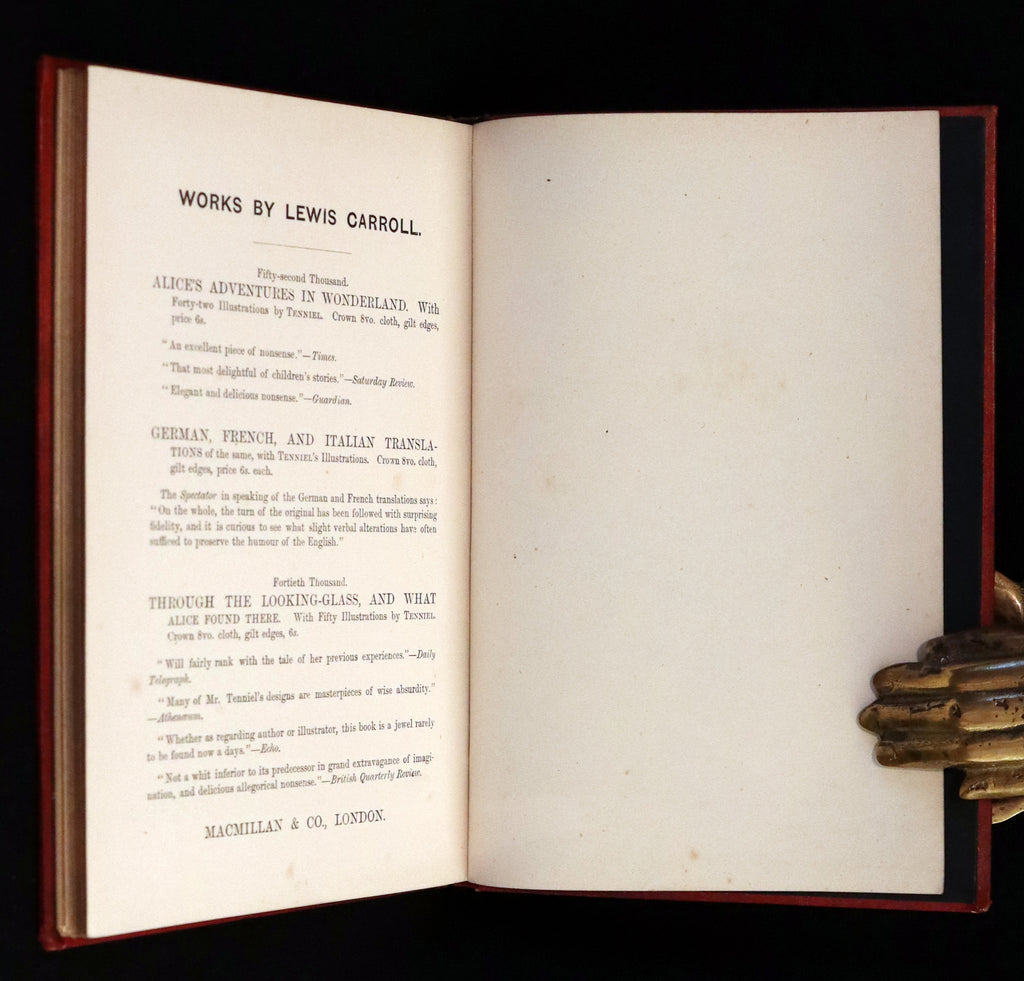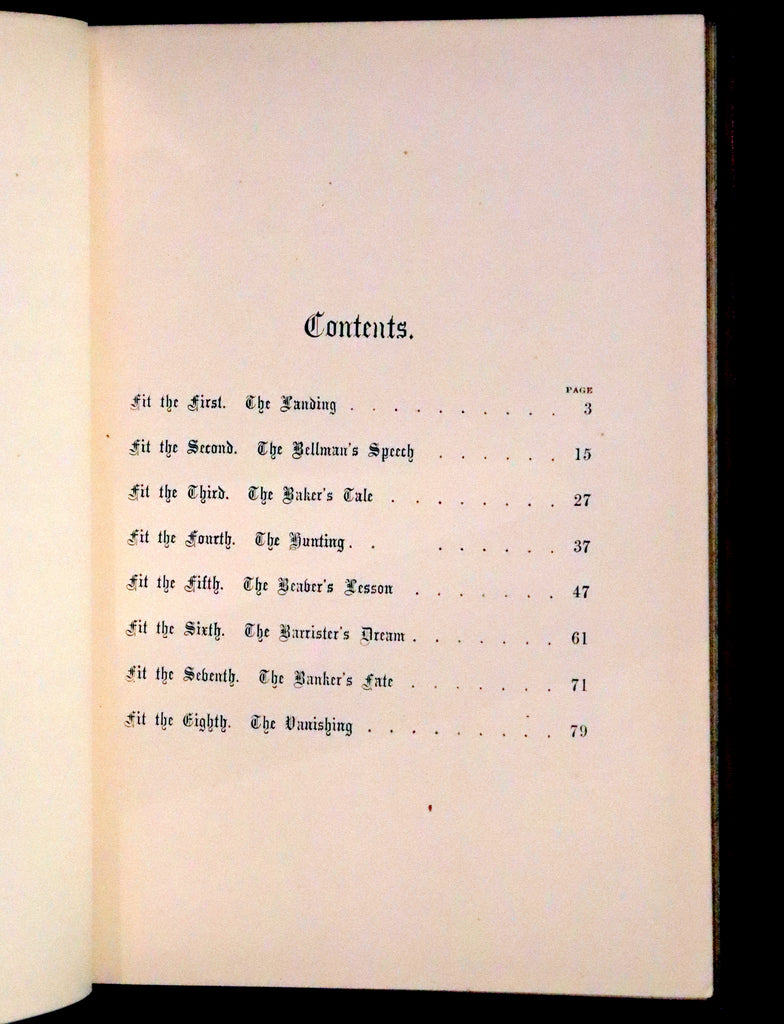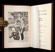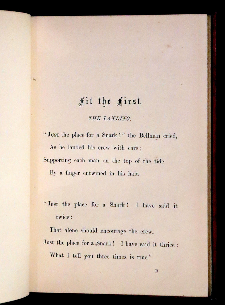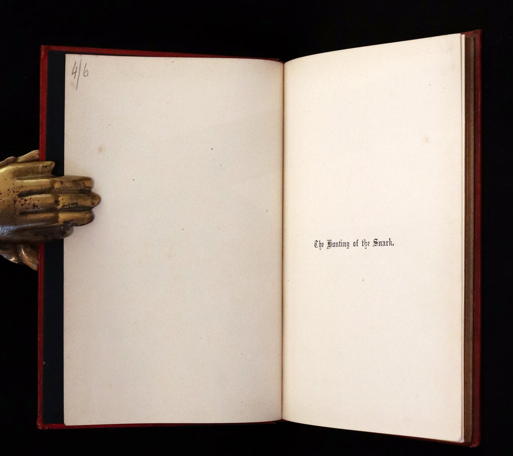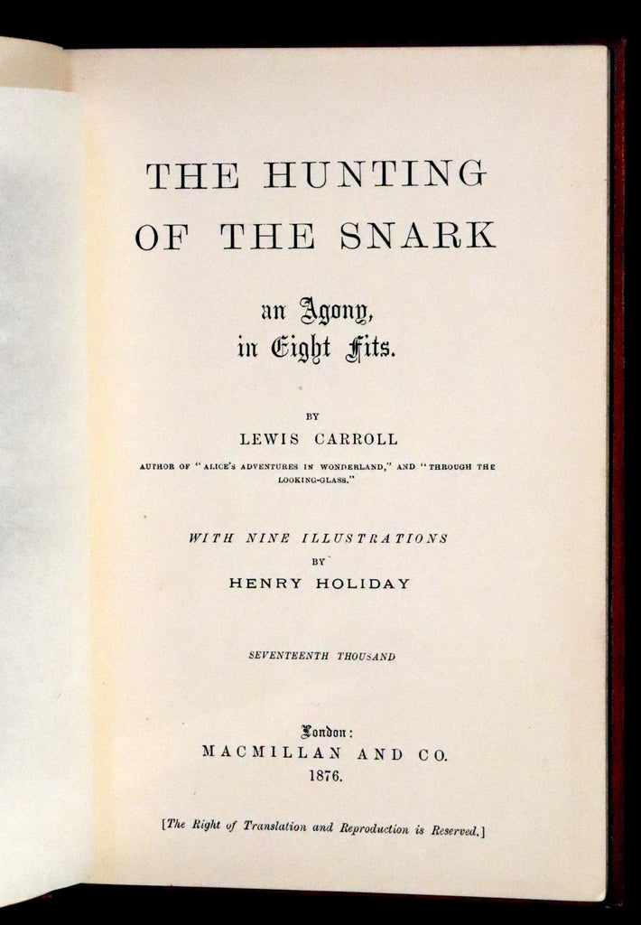 The book: Rare and attractive first edition, second reprint (seventeenth thousand) published in 1876. It has the original red cloth boards with triple-ruled gilt edging. On the front board is a gilt image of a Bellman and on the rear board is a slightly smaller image of a Beaver. The Hunting of the Snark (An Agony in 8 Fits) is a poem written by English writer Lewis Carroll. It is typically categorized as a nonsense poem. Written from 1874 to 1876, the poem borrows the setting, some creatures, and eight portmanteau words from Carroll's earlier poem "Jabberwocky" in his children's novel Through the Looking-Glass (1871).