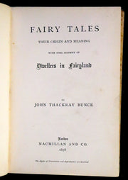 The book: Scarce and Attractive first edition of this book on Fairy Tales and Their Origin and Meaning. Bunce's work offers a thoughtful and scholarly approach to fairy tales, focusing on their symbolic meanings and cultural significance across different regions. Published in 1878, it represents a Victorian-era interest in folklore studies and would have been an important reference for those studying mythology and legends.
