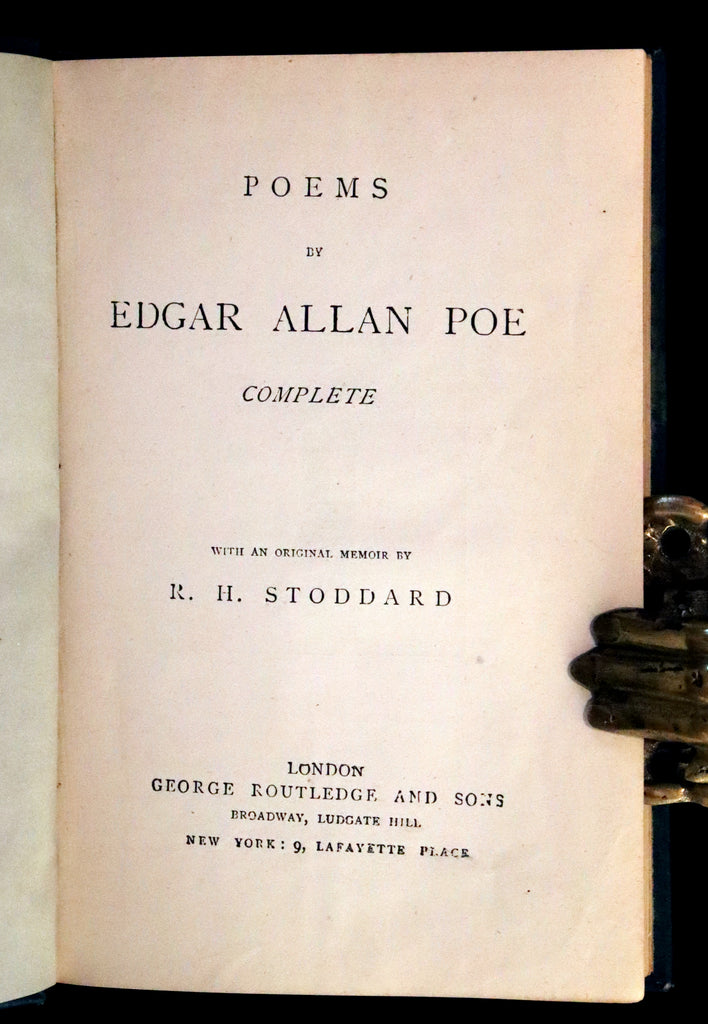 The book: Attractive and rare edition of the "Complete Poems by Edgar Allan Poe," including renowned works like "The Raven," "Lenore," and "Ulalume." This edition, published by George Routledge and Sons, London, is notable for its inclusion of an original memoir by R. H. Stoddard, offering valuable insights into Poe's life and literary legacy. The book stands as a testament to Poe's enduring influence in the world of poetry and Gothic literature.