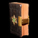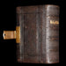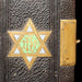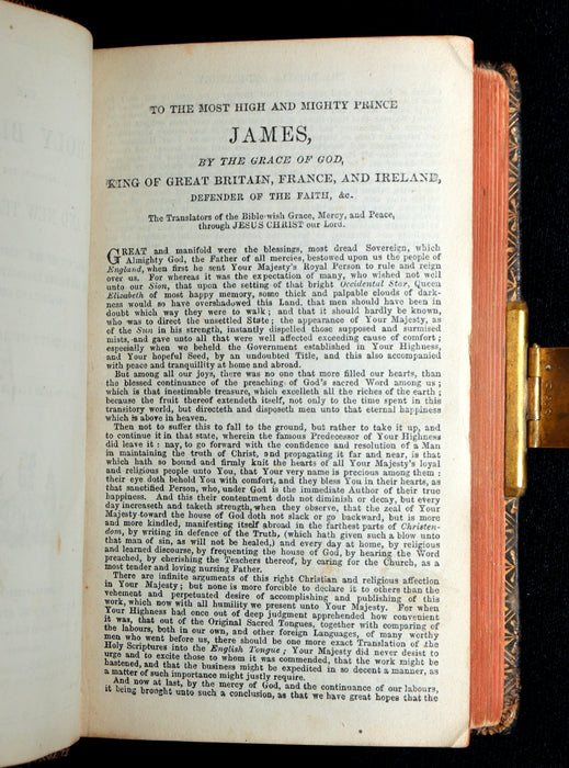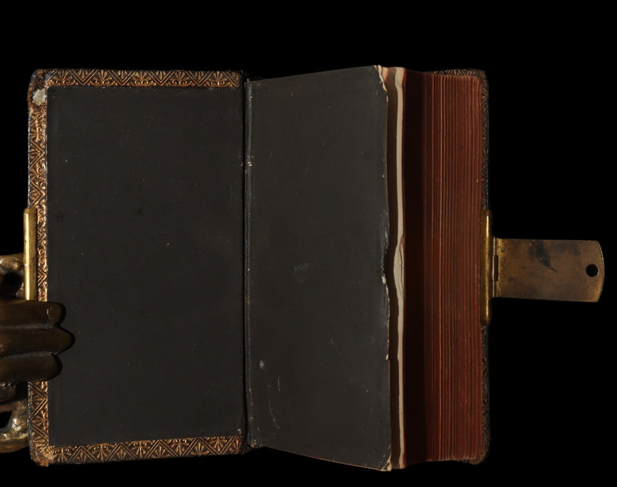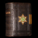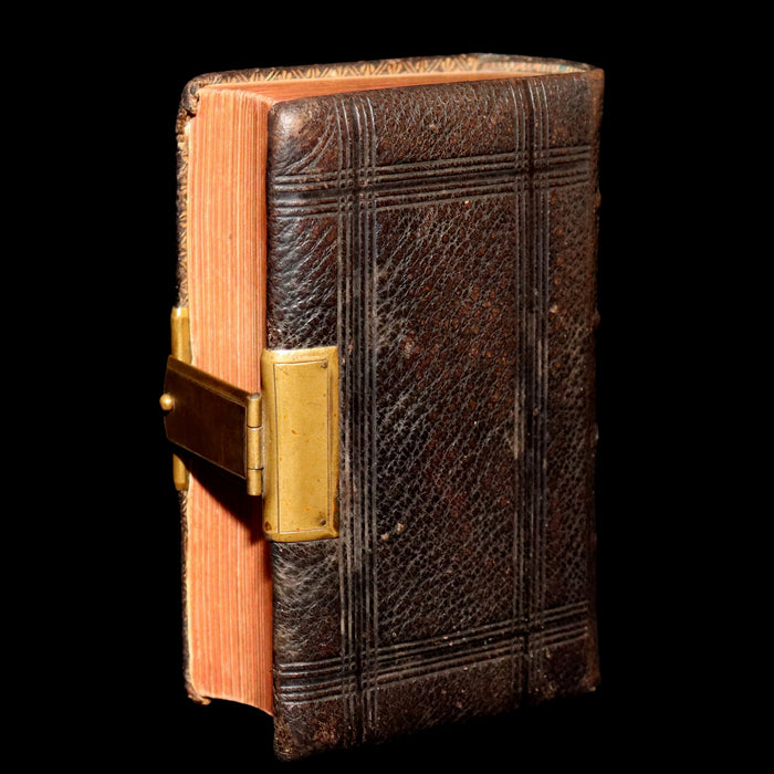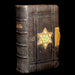 Binding: Attractive and very good original full dark brown textured leather binding, richly tooled in blind with geometric line patterns, gilt “Holy Bible” title on spine. Front board features an elaborate applied brass and enamel Star of David inset with green-enameled “IHS” Christogram, complemented by a working brass clasp. All edges gilt (faded to reddish tone), decorative gilt inner dentelles (hinges fine, overall slightly worn and scuffed - as shown) under a protective removable mylar cover. A beautiful binding!
