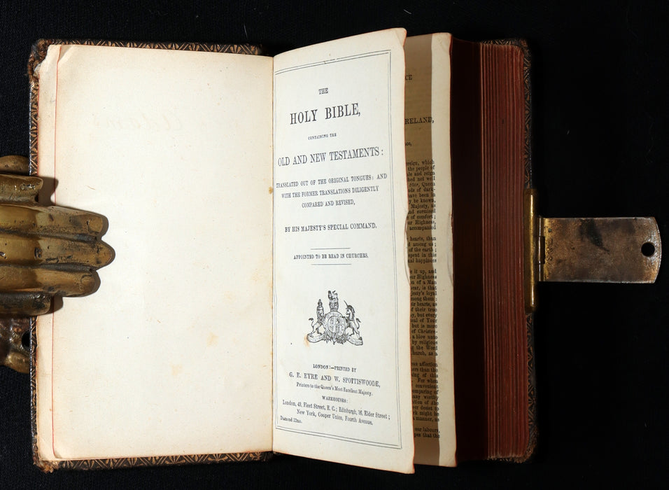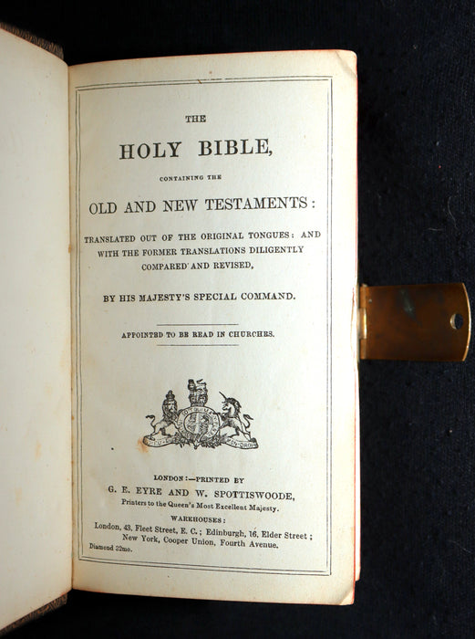 The printers: George Edward Eyre and William Spottiswoode were prominent London printers known for their royal appointments and excellence in fine printing. As official printers to the Crown, their Bibles were regarded for their textual accuracy and high production standards, contributing to the spread of Scripture in both ecclesiastical and private settings throughout the British Empire.