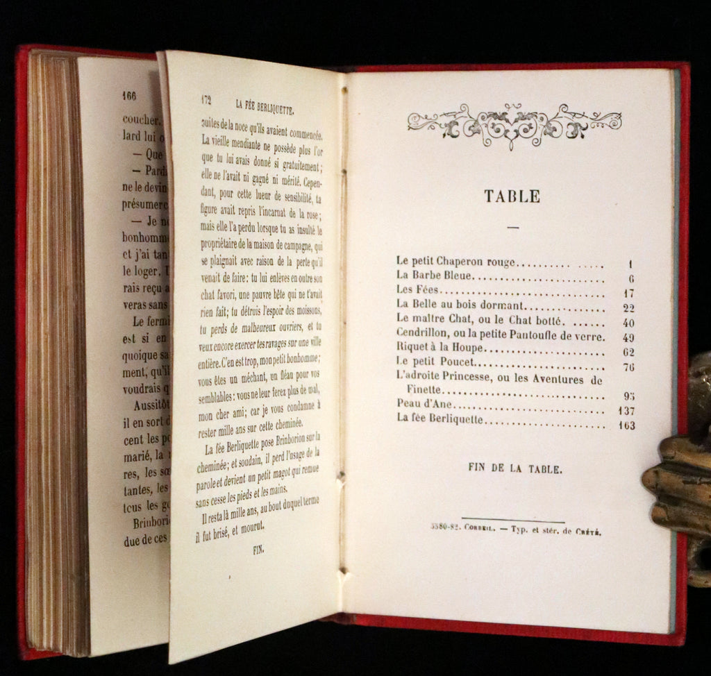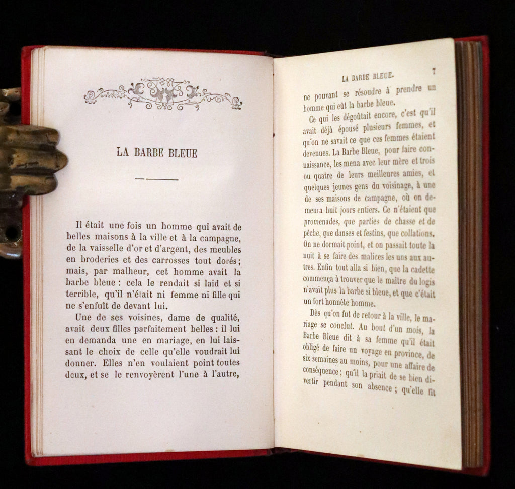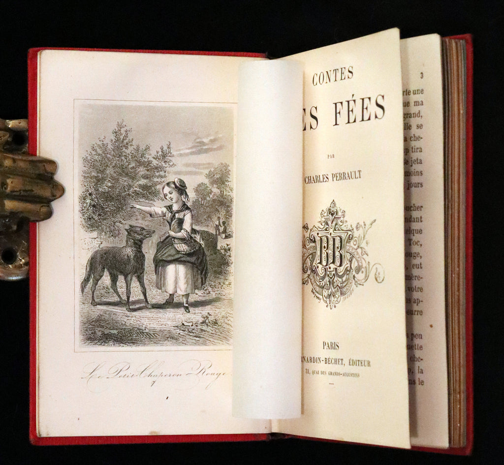 The book: Scarce and attractive 19th century illustrated french edition of Perrault's fairy tales. Including : Le Petit Chaperon rouge, La Barbe Bleue, Les Fées, La Belle au bois dormant, Le maître chat ou le Chat botté, Cendrillon ou la petite pantoufle de verre, Riquet à la Houpe, Le petit Poucet, L'Adroite Princesse ou les Aventures de Finette, Peau d'Ane, La Fée Berliquette.