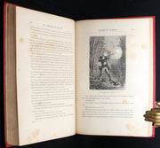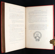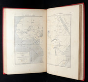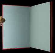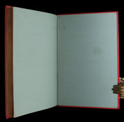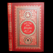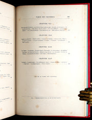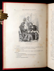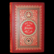 Binding: Attractive and near fine publisher’s original red cloth binding “Cartonnage aux Initiales” by Hetzel, richly decorated in gold and black, with elaborate Greek-key borders and floral gilt panels designed by Engel. The upper board displays the gilt initials “JV” (Jules Verne) and “JH” (Hetzel) within ornate medallions. The spine is equally decorative, with gilt titles and ornamented compartments (hinges fine, overall slightly scuffed - as shown) under a protective removable mylar cover. The binding remains one of the most striking examples of Hetzel’s 19th-century decorative art.