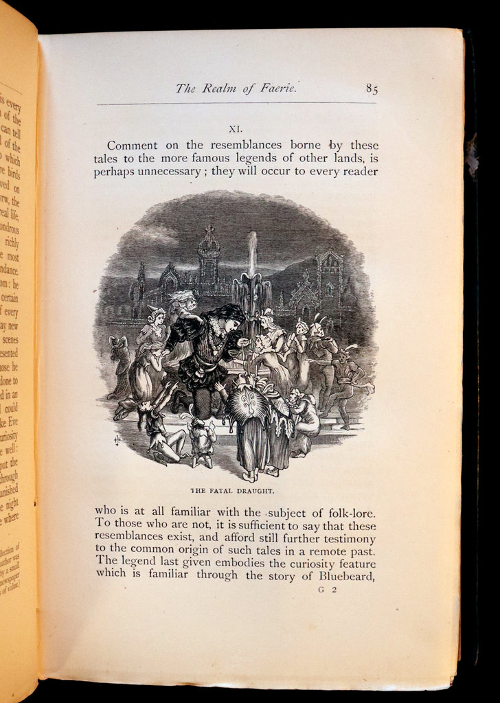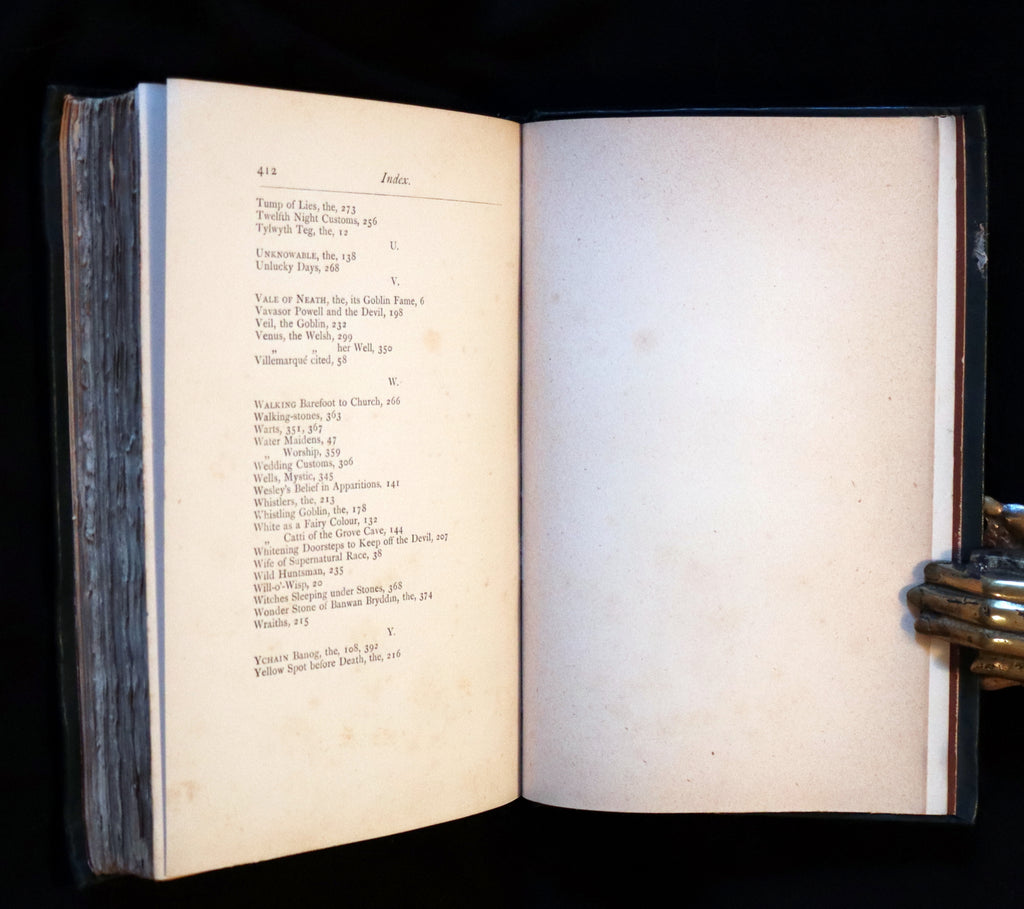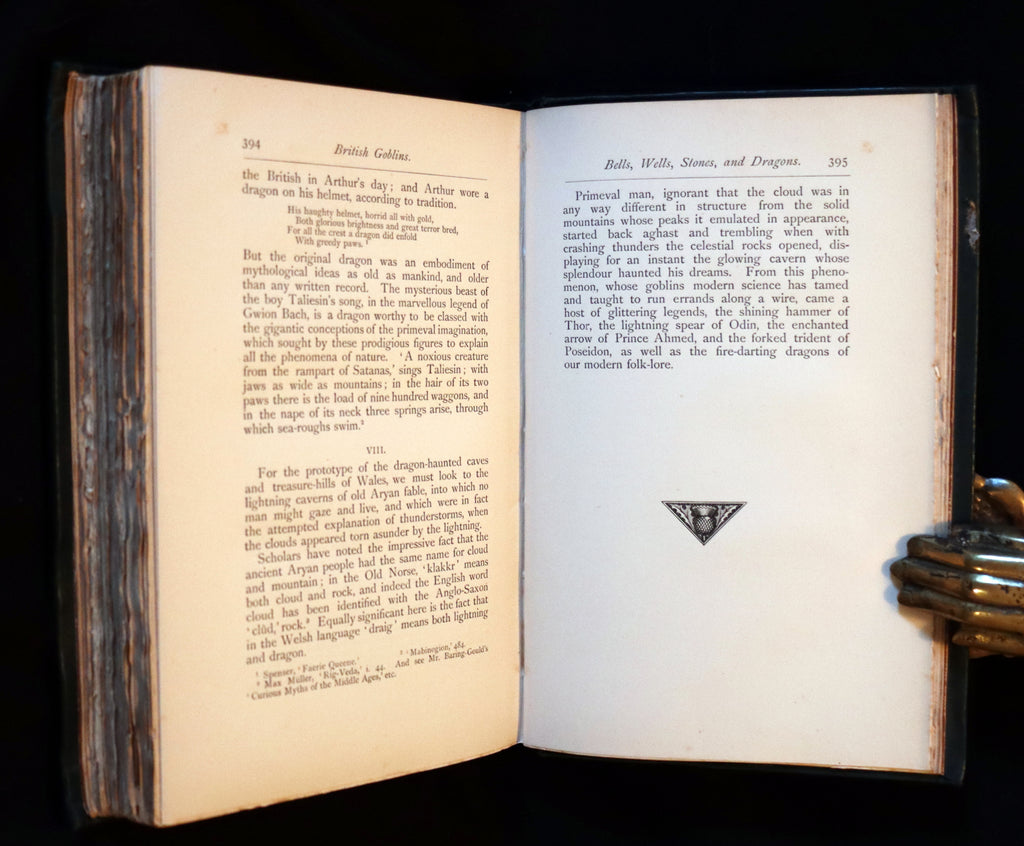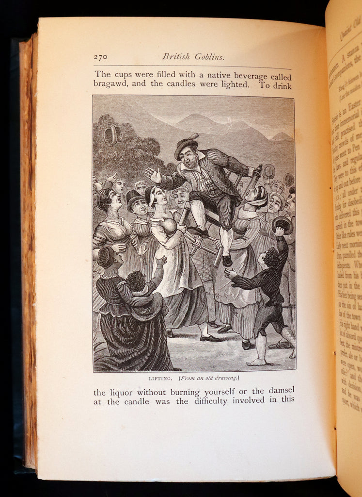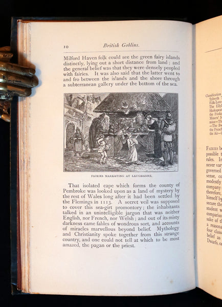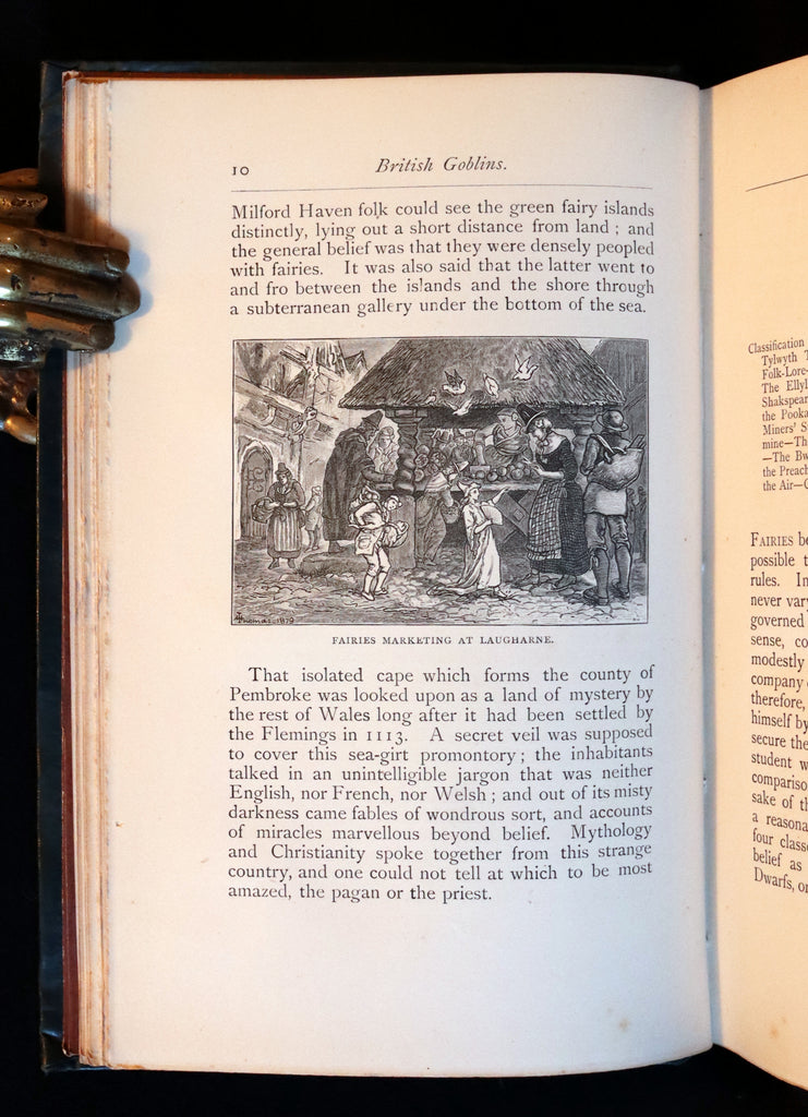 The book: Scarce First American edition of British Goblins - British Goblins does a good job at its stated purpose - collecting and loosely categorizing Welsh Folklore of every category, ranging from the reasons behind certain customs and superstitions of daily life to descriptions and associated stories of various faeries, goblins, and giants, to descriptions of apparitions and the view of the afterlife, to more fantastic things, like dragons, standing stones, and magic wells and stones. Although a somewhat anecdotal approach is taken, the author has in fact preserved a good deal of information that might have otherwise been lost.