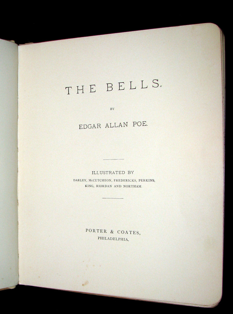 The book: Rare and attractive edition of the Bells by Edgar Allan Poe. "The Bells" is a heavily onomatopoeic poem by Edgar Allan Poe which was not published until after his death in 1849. It is perhaps best known for the diascopic use of the word "bells." The poem has four parts to it; each part becomes darker and darker as the poem progresses from "the jingling and the tinkling" of the bells in part 1 to the "moaning and the groaning" of the bells in part 4.