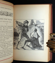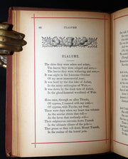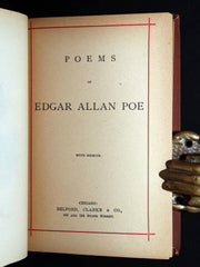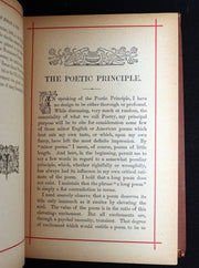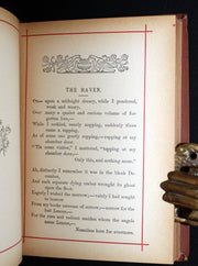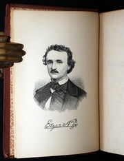 The book: A handsome Victorian gift edition of Poe’s celebrated poems, issued in an ornate publisher’s cloth binding typical of late nineteenth-century American decorative book design. The volume gathers many of Poe’s most enduring works—among them “The Raven,” “Annabel Lee,” and “Israfel”—presented in a format meant to appeal to both readers and collectors. The elaborate gilt-blocked cover, combined with all edges gilt and evocative full-page plates, reflects the period’s fascination with luxurious yet affordable literary editions intended for display in the parlour or library. Such copies, when complete with their illustrations and in original decorative cloth, remain highly desirable examples of nineteenth-century Poe reception and book artistry.