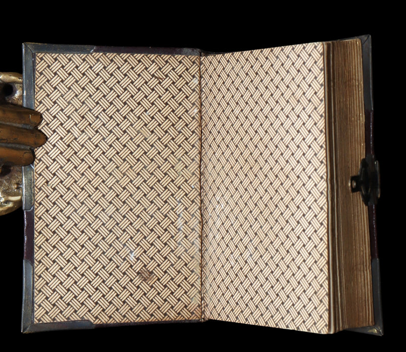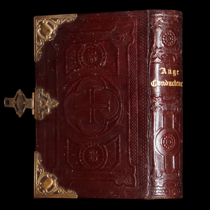 Binding: Attractive and very good original full burgundy leather binding with richly blind-stamped ecclesiastical motifs and ornate gilt borders. Embellished with all four heavy brass corner-pieces and a working central clasp, complete and functional. Gilt title "Ange Conducteur" on the spine. All edges richly gilt and beautifully engraved with a fleur-de-lys motif, creating a radiant decorative effect when the book is closed. (hinges fine, overall slightly scuffed - as shown) under a protective removable mylar cover. A beautiful and devotional object in itself!