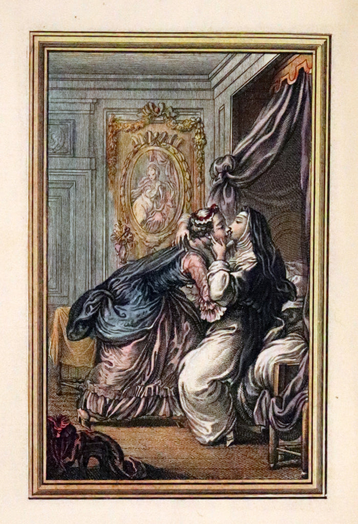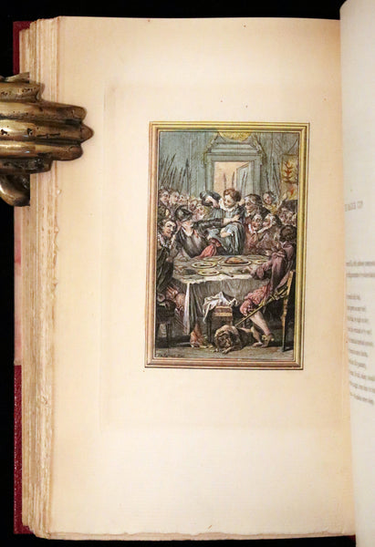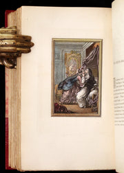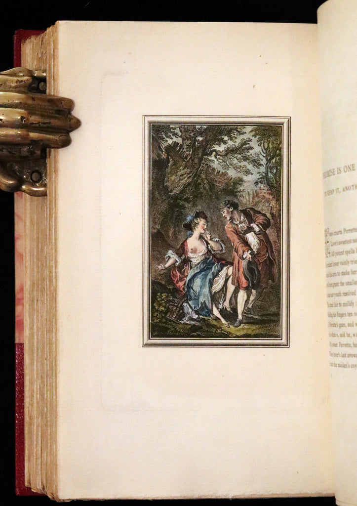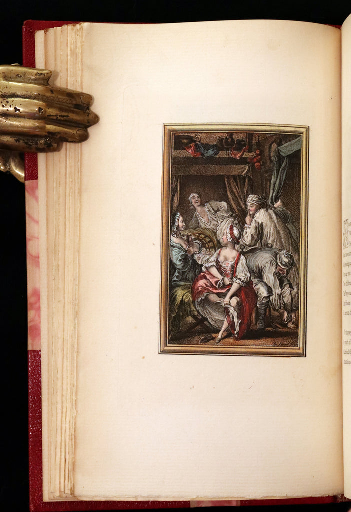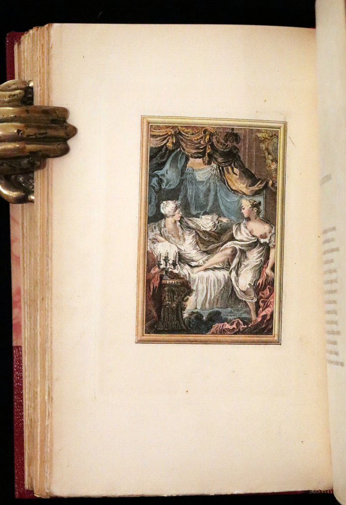 The books: Scarce limited extra color-illustrated edition of those De La Fontaine's lusty stories illustrated by Eisen in a very nice binding! "A lover of nature, of keen intelligence, power of observation and poetic genius", Jean de La Fontaine, best known for his popular animal fables enjoyed by generations of children, penned stories in a decidedly different vein with his Contes et Nouvelles en vers. "The first [of the tales] was published in 1664, the last posthumously. He borrowed them mostly from Italian sources, in particular Giovanni Boccaccio… The essence of nearly all his Contes lies in their licentiousness… The accent of La Fontaine the narrator enlivens the story with playfully capricious comments, explanations and digressions". "Eisen’s 85 designs for La Fontaine [first published in 1762] are the liveliest and most adroit that he ever drew. Thoroughly at home with the varied action of these lusty stories—their love passages, their intrigues, their practical jokes—he is also expert in choosing the moment in each that will best serve his purpose as an illustrator". This edition of Tales and Novels is a later English verse translation. With 85 beautiful illustrations by Eisen.