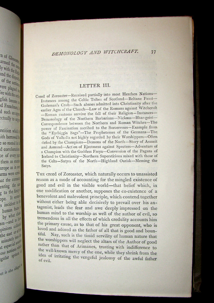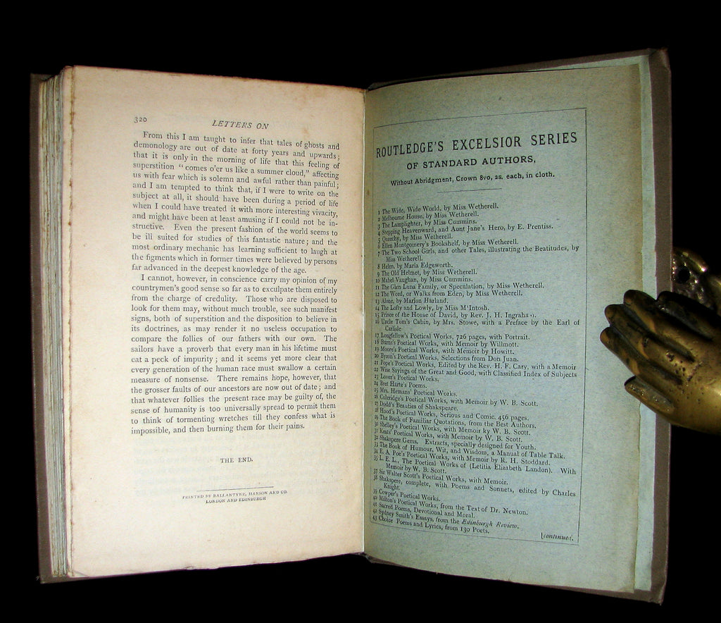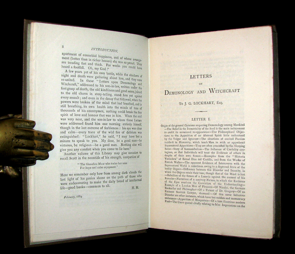 The book : Rare Victorian edition of Letters on Demonology and Witchcraft in his original binding. -- In ill health following a stroke, Sir Walter Scott wrote Letters on Demonology and Witchcraft at the behest of his son-in-law, J. G. Lockhart, who worked for a publishing firm. Letters was written when educated society believed itself in enlightened times due to advances in modern science. Letters, however, revealed that all social classes still held beliefs in ghosts, witches, warlocks, fairies, elves, diabolism, the occult, and even werewolves. Sourcing from prior sixteenth- and seventeenth-century treatises on demonology along with contemporary accounts from England, Europe, and North America (Cotton Mather's Magnalia Christi, for one), Scott's discourses on the psychological, religious, physical, and preternatural explanations for these beliefs are essential reading for acolytes of the dark and macabre; the letters dealing with witch hunts, trials (Letters Eight and Nine), and torture are morbidly compelling. Scott was neither fully pro-rational modernity nor totally anti-superstitious past, as his skepticism of one of the "new" sciences (skullology, as he calls it) is made clear in a private letter to a friend. Thus, Letters is both a personal and intellectual examination of conflicting belief systems, when popular science began to challenge superstition in earnest.