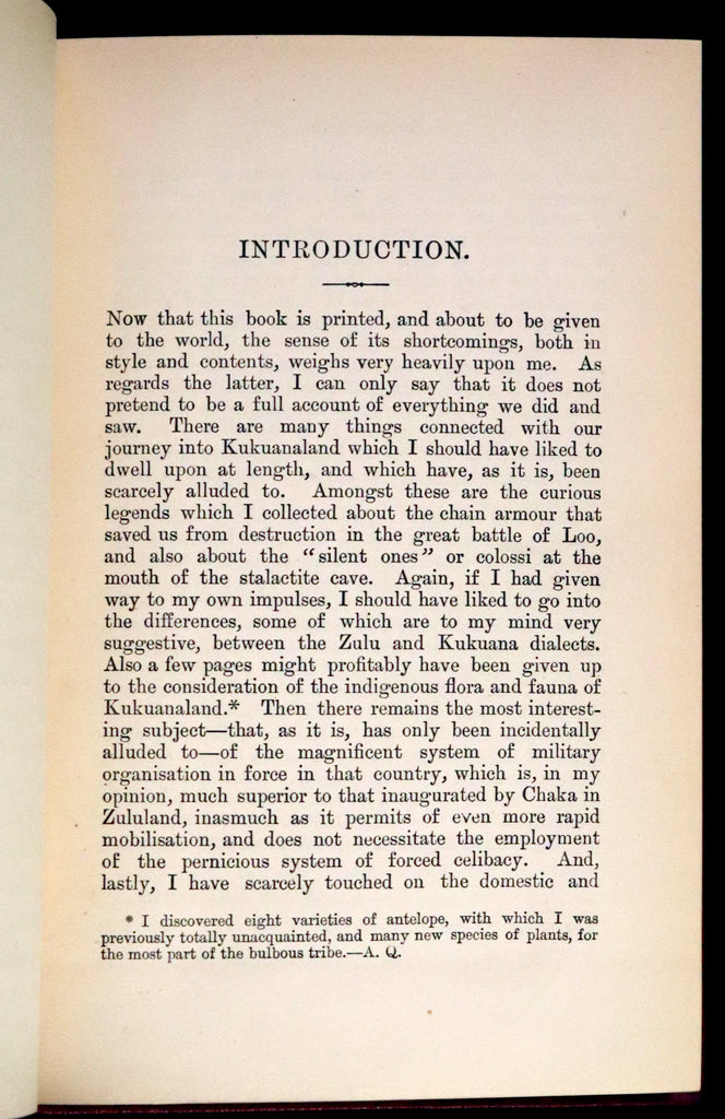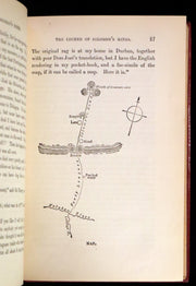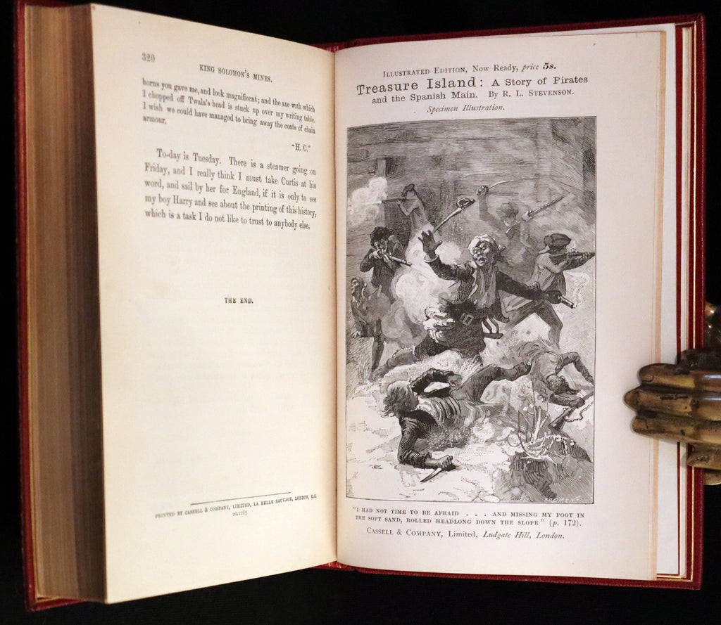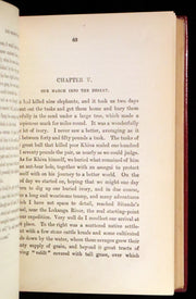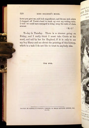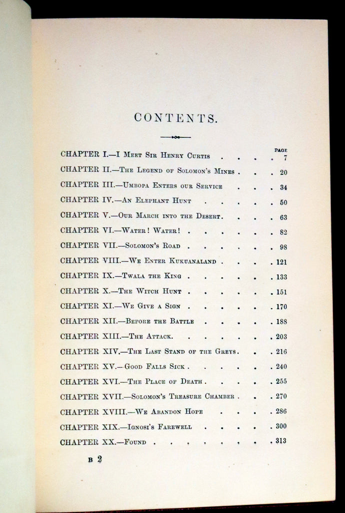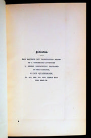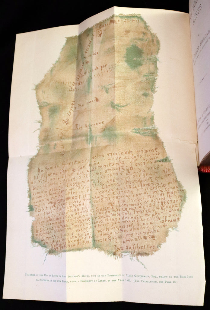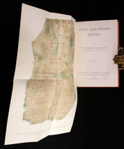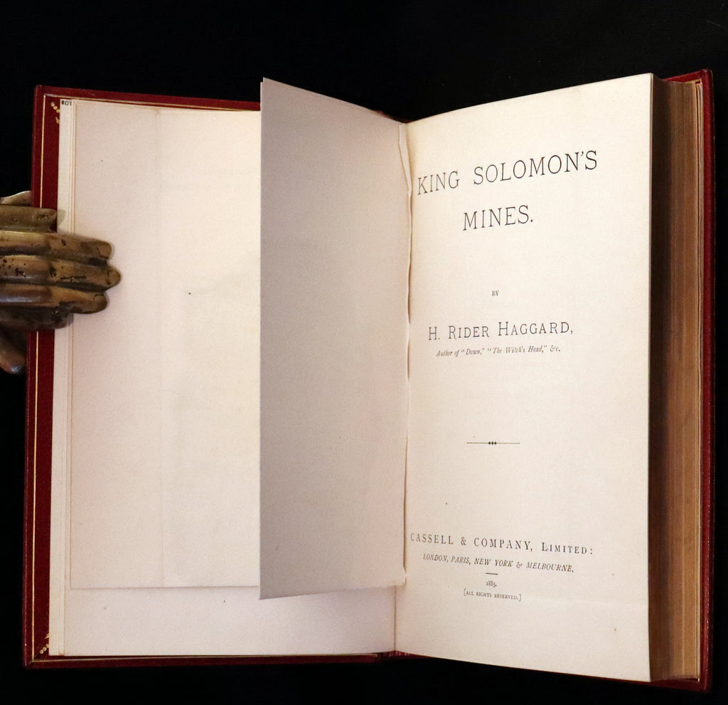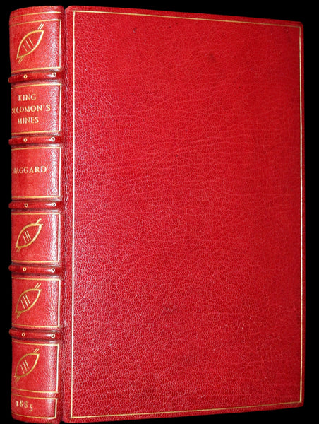 The book: Attractive and wonderfully bound later printing of the First edition of King Solomon's Mines (1885) -- a popular novel by the English Victorian adventure writer and fabulist Sir H. Rider Haggard. It tells of a search of an unexplored region of Africa by a group of adventurers led by Allan Quatermain for the missing brother of one of the party. It is one of the first English adventure novels set in Africa and is considered to be the genesis of the lost world literary genre.