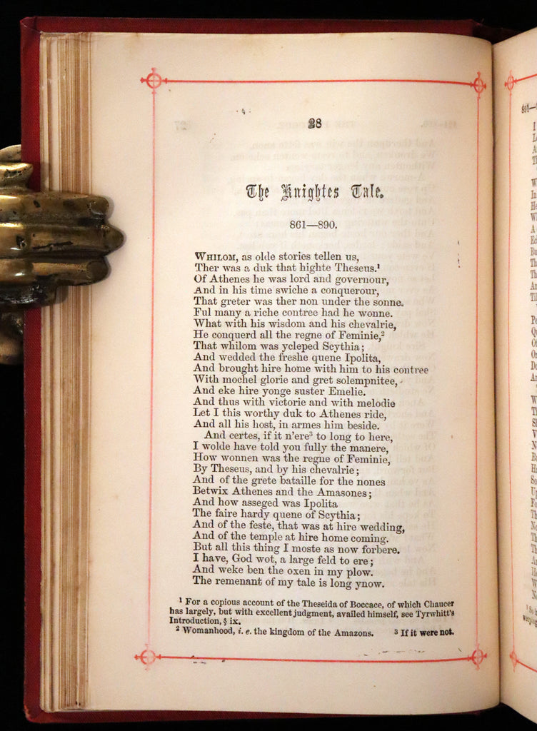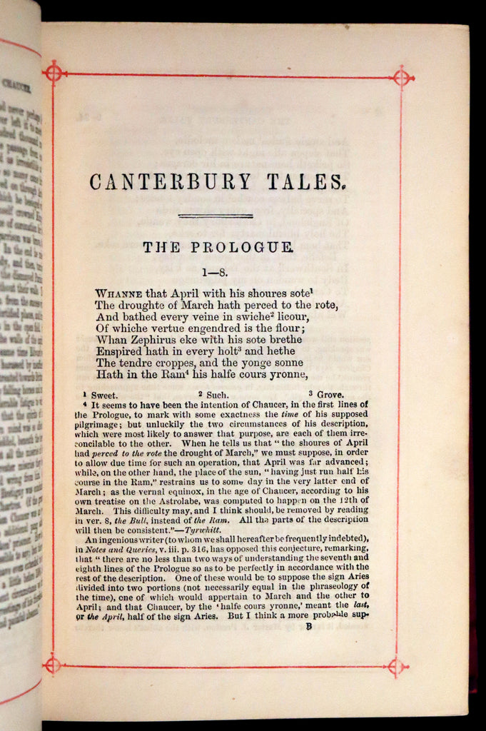 The book: Beautiful Victorian edition of The Canterbury Tales (Middle English: Tales of Caunterbury) -- a collection of twenty-four stories that runs to over 17,000 lines written in Middle English by Geoffrey Chaucer between 1387 and 1400. It is widely regarded as Chaucer's magnum opus. The tales (mostly written in verse, although some are in prose) are presented as part of a story-telling contest by a group of pilgrims as they travel together from London to Canterbury to visit the shrine of Saint Thomas Becket at Canterbury Cathedral. The prize for this contest is a free meal at the Tabard Inn at Southwark on their return.