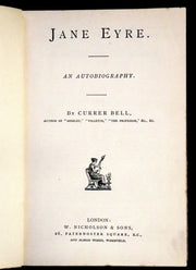 The book: Nice Victorian Edition of Jane Eyre by Charlotte Brontë, published under her pseudonym Currer Bell. This edition represents a beautifully bound Victorian rendition of one of the most celebrated novels in English literature. Jane Eyre tells the story of an orphaned girl who rises above her troubled childhood to find independence and love, set against the backdrop of Gothic elements and deep moral questioning. This particular edition was produced by W. Nicholson & Sons, a London publisher known for handsomely designed books.