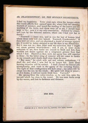 The book: Scarce Victorian early edition of Frankenstein; or, The Modern Prometheus -- a novel written by English author Mary Shelley (1797–1851) that tells the story of Victor Frankenstein, a young scientist who creates a grotesque but sapient creature in an unorthodox scientific experiment. Shelley started writing the story when she was 18, and the first edition of the novel was published anonymously in London on 1 January 1818, when she was 20. Her name first appeared in the second edition, published in France in 1823. A rare find in any condition!