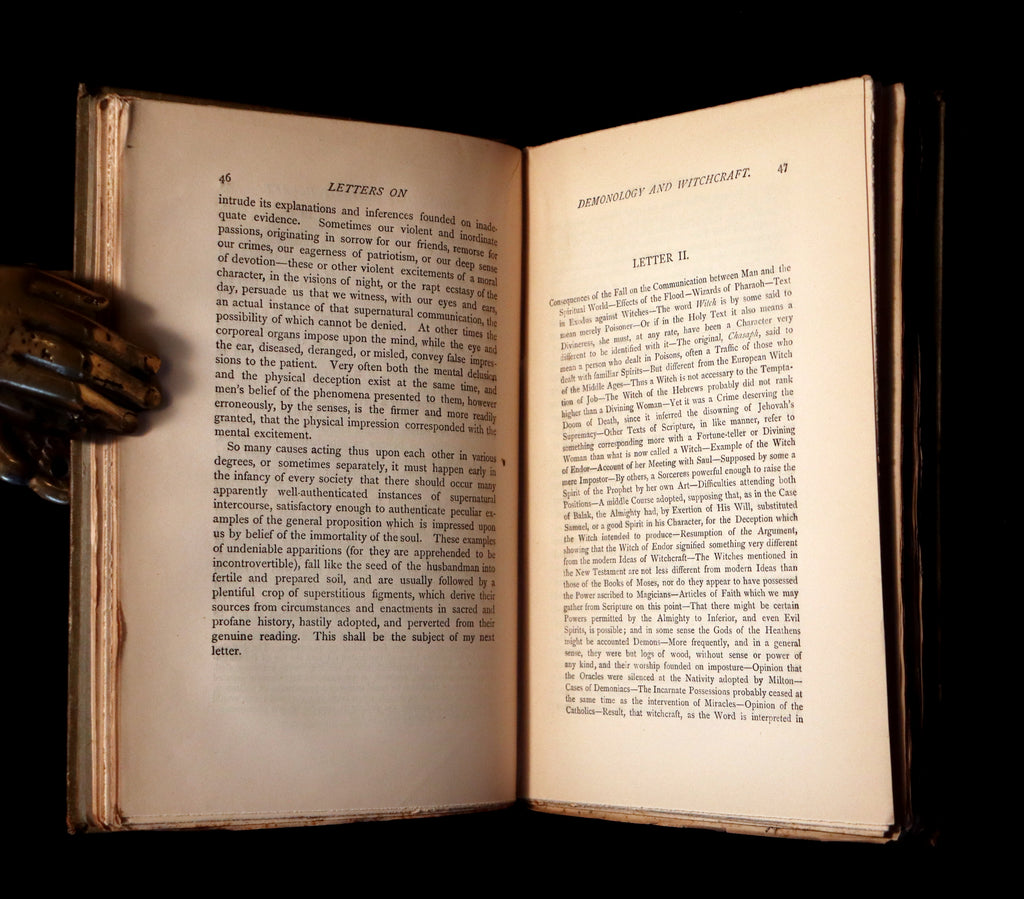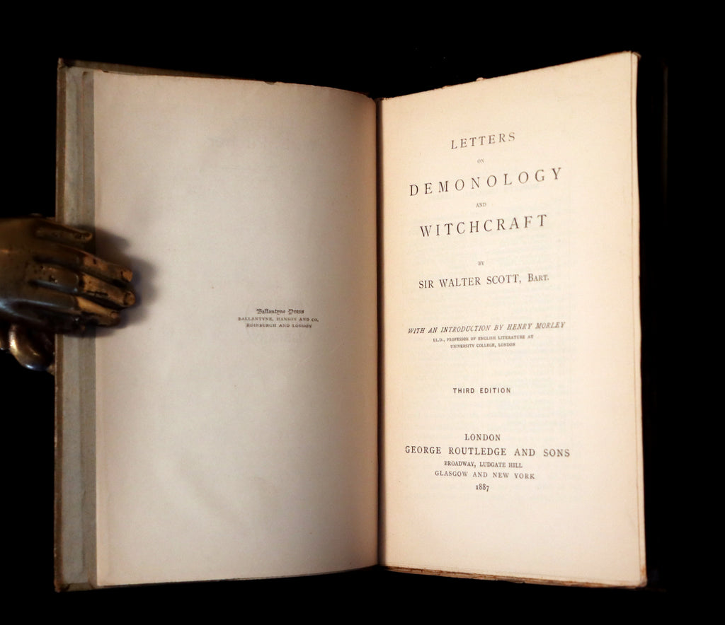 The book : Rare Victorian third edition of Letters on Demonology and Witchcraft in his original binding. -- In ill health following a stroke, Sir Walter Scott wrote Letters on Demonology and Witchcraft at the behest of his son-in-law, J. G. Lockhart, who worked for a publishing firm. Letters was written when educated society believed itself in enlightened times due to advances in modern science. Letters, however, revealed that all social classes still held beliefs in ghosts, witches, warlocks, fairies, elves, diabolism, the occult, and even werewolves. Sourcing from prior sixteenth- and seventeenth-century treatises on demonology along with contemporary accounts from England, Europe, and North America (Cotton Mather's Magnalia Christi, for one), Scott's discourses on the psychological, religious, physical, and preternatural explanations for these beliefs are essential reading for acolytes of the dark and macabre; the letters dealing with witch hunts, trials (Letters Eight and Nine), and torture are morbidly compelling. Scott was neither fully pro-rational modernity nor totally anti-superstitious past, as his skepticism of one of the "new" sciences (skullology, as he calls it) is made clear in a private letter to a friend. Thus, Letters is both a personal and intellectual examination of conflicting belief systems, when popular science began to challenge superstition in earnest.