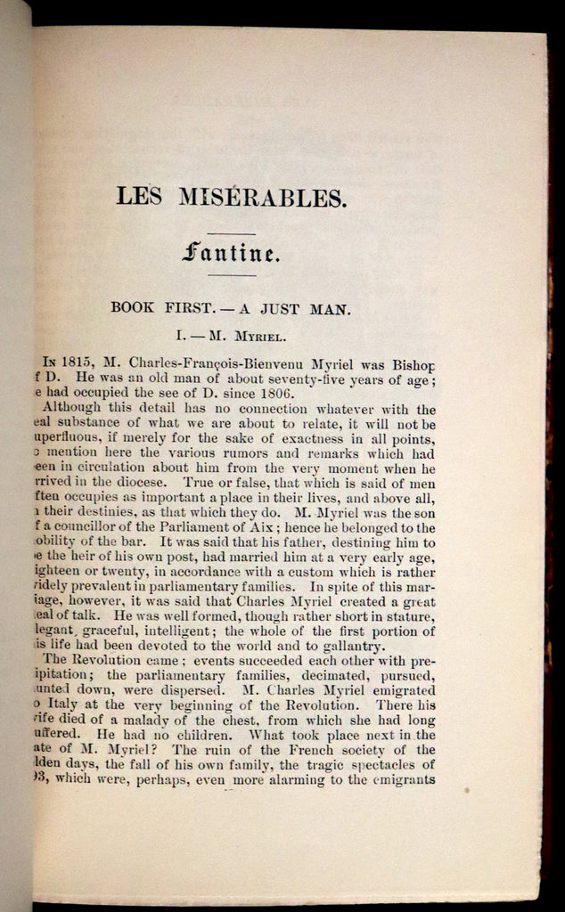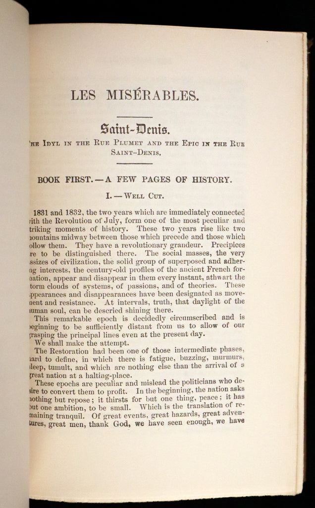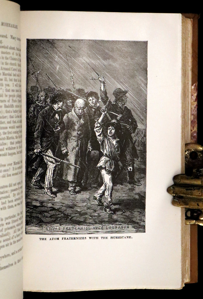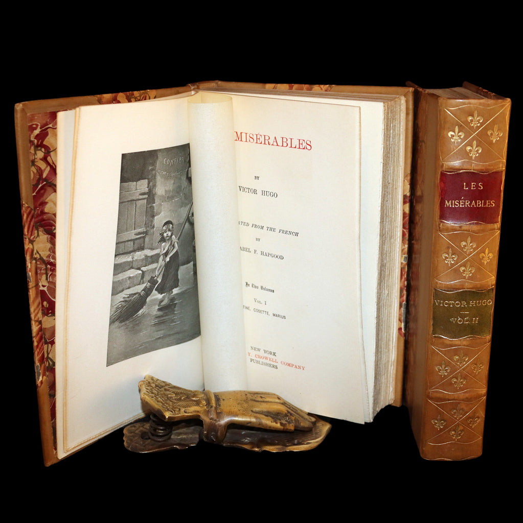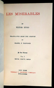 The books: Attractively bound in half morocco leather and a rare complete edition of Les Misérables -- a French historical novel by Victor Hugo, first published in 1862, that is considered one of the greatest novels of the 19th century. In the English-speaking world, the novel is usually referred to by its original French title. However, several alternatives have been used, including The Miserables, The Wretched, The Miserable Ones, The Poor Ones, The Wretched Poor, The Victims and The Dispossessed. Beginning in 1815 and culminating in the 1832 June Rebellion in Paris, the novel follows the lives and interactions of several characters, particularly the struggles of ex-convict Jean Valjean and his experience of redemption.