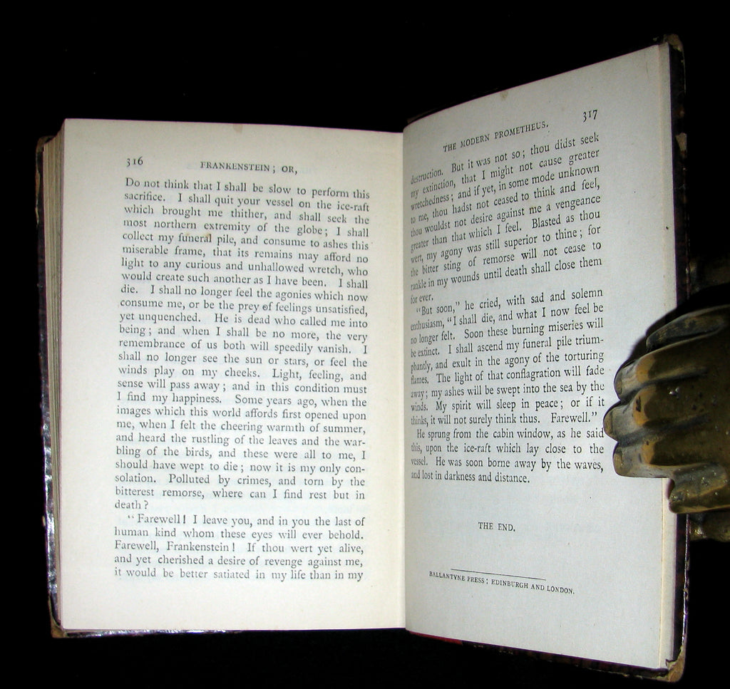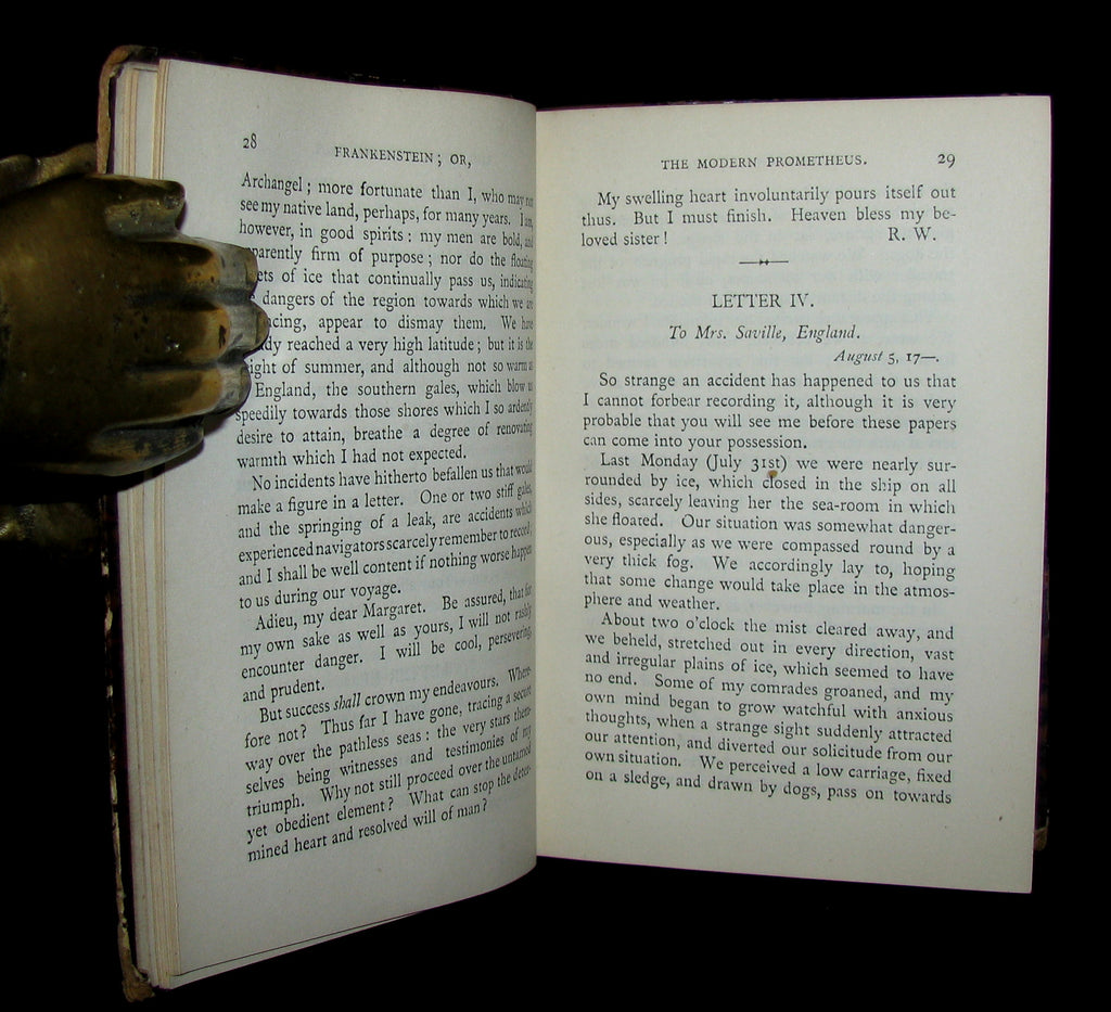 The book : Rare Victorian edition of Frankenstein; or, The Modern Prometheus -- a novel written by English author Mary Shelley (1797–1851) that tells the story of Victor Frankenstein, a young scientist who creates a grotesque but sapient creature in an unorthodox scientific experiment. Shelley started writing the story when she was 18, and the first edition of the novel was published anonymously in London on 1 January 1818, when she was 20. Her name first appeared on the second edition, published in France in 1823.