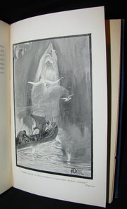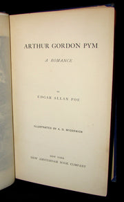 The book : Rare in any condition and very attractive 1880's edition of Arthur Gordon Pym- The Narrative of Arthur Gordon Pym of Nantucket (1838) is the only complete novel written by American writer Edgar Allan Poe. The work relates the tale of the young Arthur Gordon Pym, who stows away aboard a whaling ship called the Grampus. Various adventures and misadventures befall Pym, including shipwreck, mutiny, and cannibalism, before he is saved by the crew of the Jane Guy. Aboard this vessel, Pym and a sailor named Dirk Peters continue their adventures farther south. Docking on land, they encounter hostile black-skinned natives before escaping back to the ocean. The novel ends abruptly as Pym and Peters continue toward the South Pole.