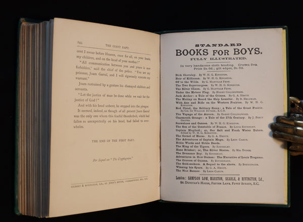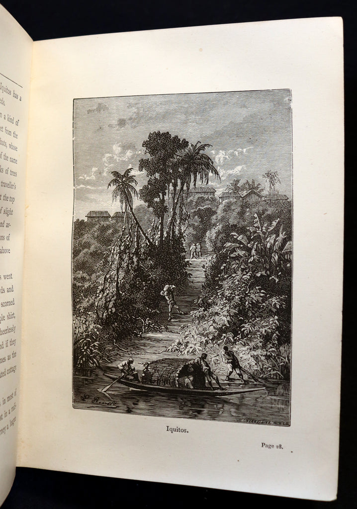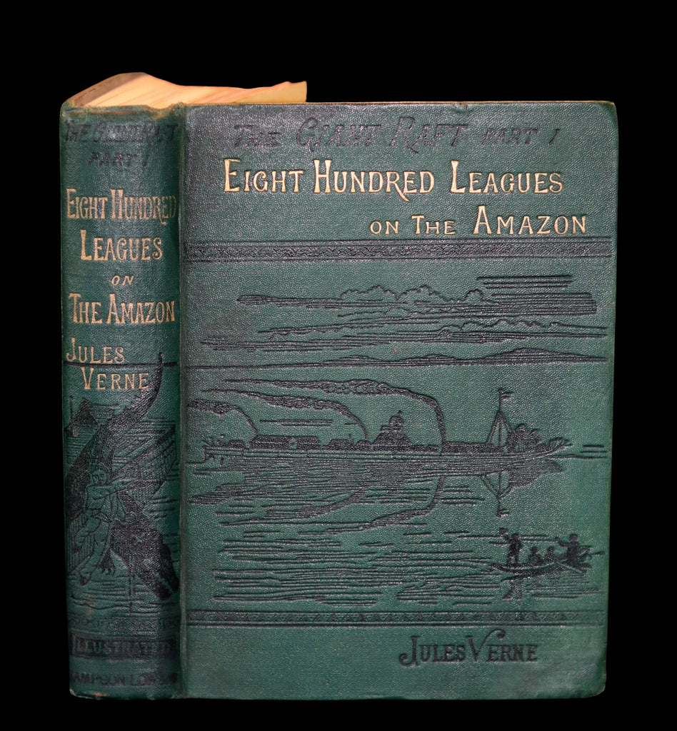 The book: Scarce and attractive Sampson Low edition of Eight Hundred Leagues on the Amazon (French: La Jangada - Huit Cents lieues sur l'Amazone) -- a novel by Jules Verne, published in 1881. It has also been published as The Giant Raft. It is an adventure novel. This novel involves how Joam Garral, a ranch owner who lives near the Peruvian-Brazilian border on the Amazon River, is forced to travel down-stream when his past catches up with him. Most of the novel is situated on a large jangada (a Brazilian timber raft) that is used by Garral and his family to float to Belém at the river's mouth. Many aspects of the raft, scenery, and journey are described in detail.