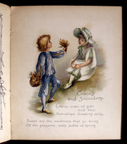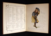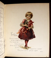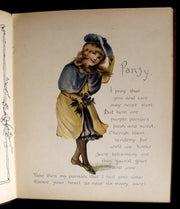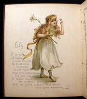 The book: Scarce Victorian Floriography book printed in Bavaria for Ernest Nister with 12 enchanting chromolithograph plates each of a very pretty young girl dressed beautifully in the petals of a flower or plant. Around the image is a short verse about the plant. Part I of the text lists flowers in alphabetical order and the qualities associated with them. Part II lists qualities in alphabetical order and the flowers associated with them, text printed within floral borders.