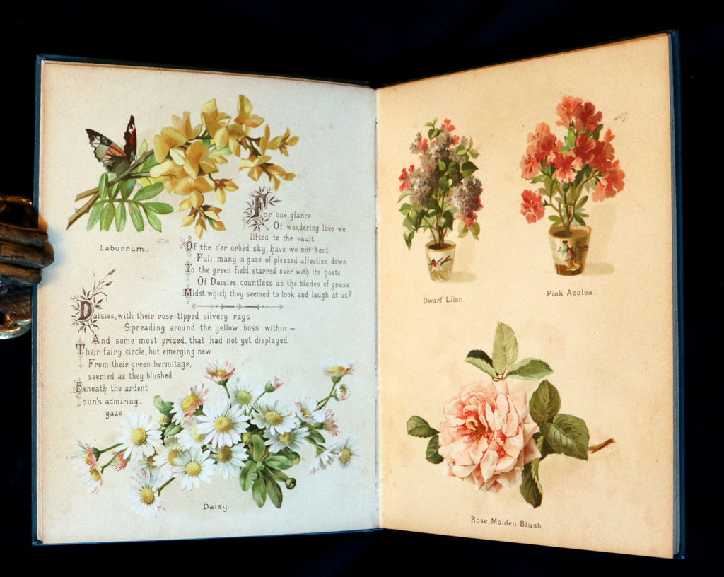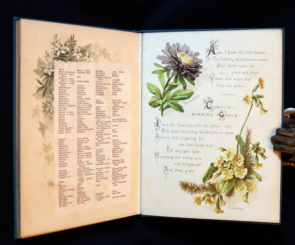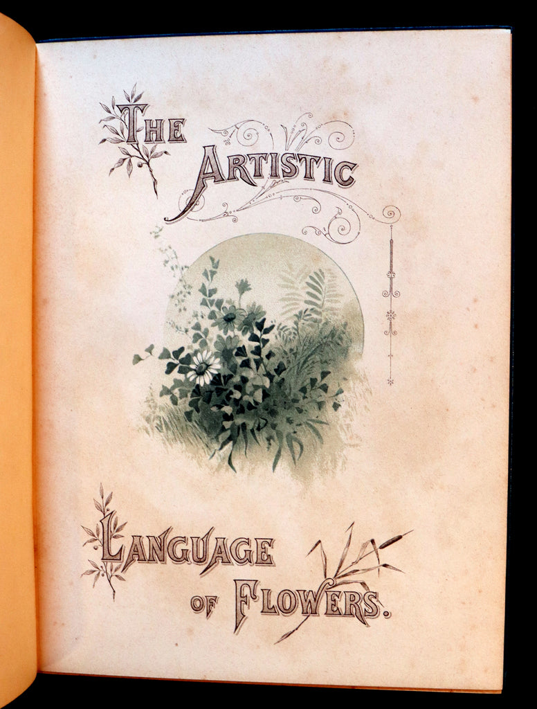 The book: Scarce find in any condition! Very attractive edition of this floriography book containing a vocabulary of plants in two parts; the first part lists plant names followed by their meanings while the second part lists meanings followed by plant names.