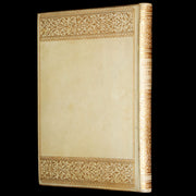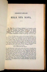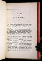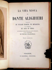 The book: This exquisite 1892 edition of "La Vita Nuova" by Dante Alighieri, along with his treatises "De vulgari eloquio," "De monarchia," and "La questione de aqua et terra," comes beautifully bound in gilt-decorated vellum by the renowned Giulio Giannini bindery. The edition is notable for its inclusion of Italian translations of works originally written in Latin by Dante, accompanied by notes by Pietro Fraticelli, offering readers a comprehensive view of Dante's lesser-known works alongside his famous narrative of courtly love.