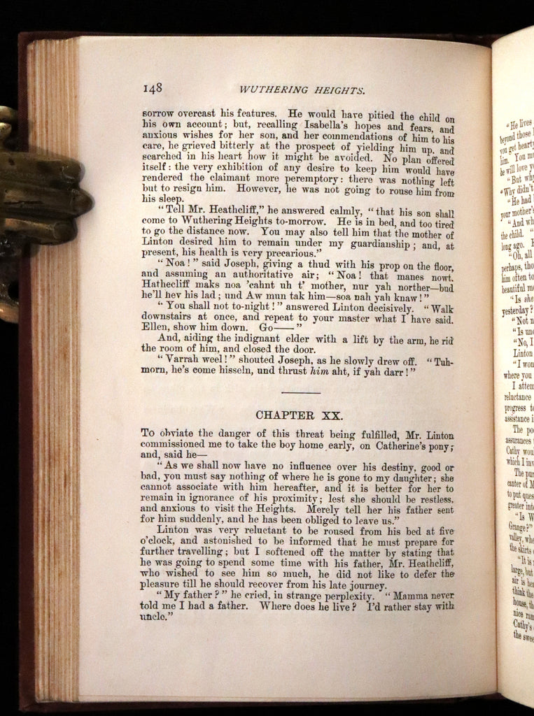 The book: Attractive and scarce 1892 edition of Wuthering Heights -- a novel by Emily Brontë published in 1847 under her pseudonym "Ellis Bell". It is her only finished novel. Wuthering Heights and Anne Brontë's Agnes Grey were accepted by publisher Thomas Newby before the success of her sister Charlotte's novel Jane Eyre. After Emily's death, Charlotte edited a posthumous second edition in 1850. Although Wuthering Heights is now a classic of English literature, contemporary reviews were deeply polarised; it was controversial because of its unusually stark depiction of mental and physical cruelty, and it challenged Victorian ideas about religion, morality, class, and a woman's place in society.