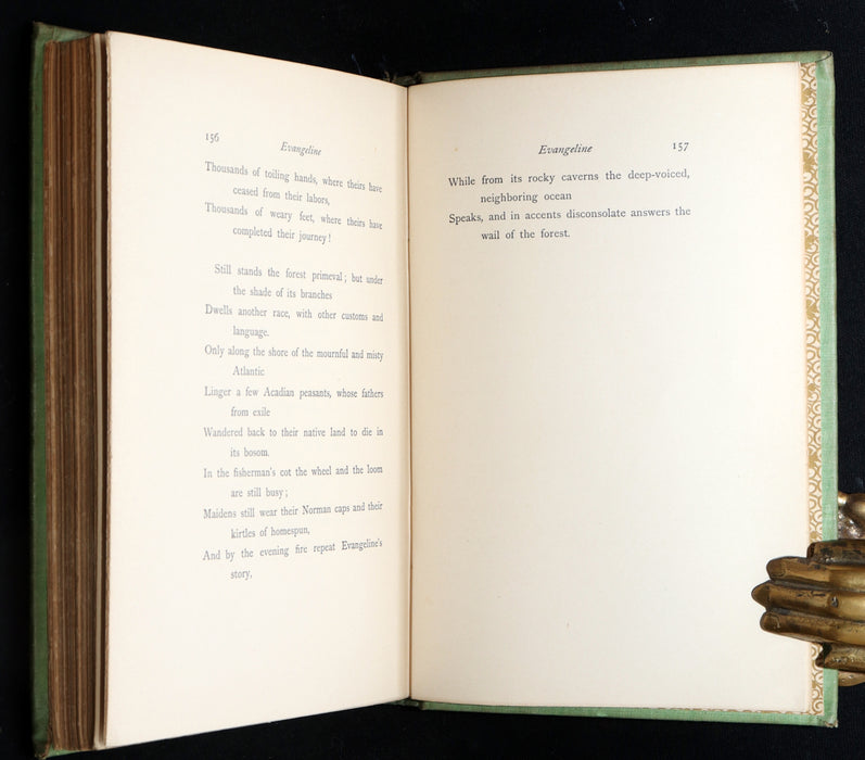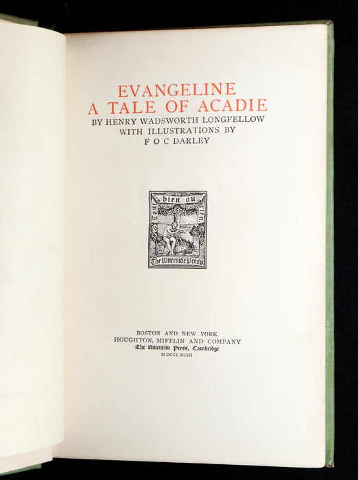 The book: A lovely illustrated edition of Evangeline: A Tale of Acadie, Longfellow’s enduring romantic epic about the Acadian expulsion. This 1893 edition, printed by the renowned Riverside Press and illustrated by F.O.C. Darley, presents the poem with a blend of literary richness and artistic charm. The Arts and Crafts-style binding, with its floral symmetry and clean typography, makes this a visually elegant collector’s piece.