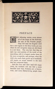 The book: Rare First Edition of those Finnish Legends for English Children with seven Illustrations. From the Preface: "The following stories cover almost all of the songs of the Kalevala, the epic of the Finnish people. They will lead the English child into a new region in the fairy world, yet one where he will recognise many an old friend in a new form" .